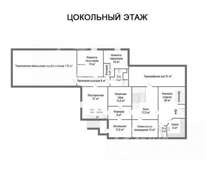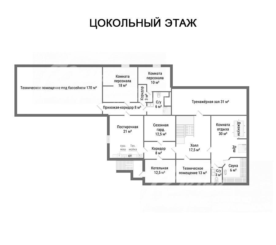 Цоколь: холл 17,5 кв.м, коридор 8 кв.м, сезонная гардеробная 12,5 кв.м, тренажёрный зал 31 кв.м, котельная 12,5 кв.м, санузел 6 кв.м, техническое помещение 13 кв.м, постирочная 21 кв.м, коридор 8 кв.м, техническое помещение под бассейном 170 кв.м
