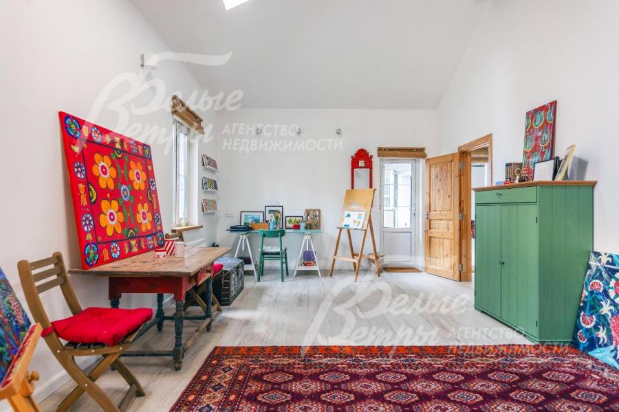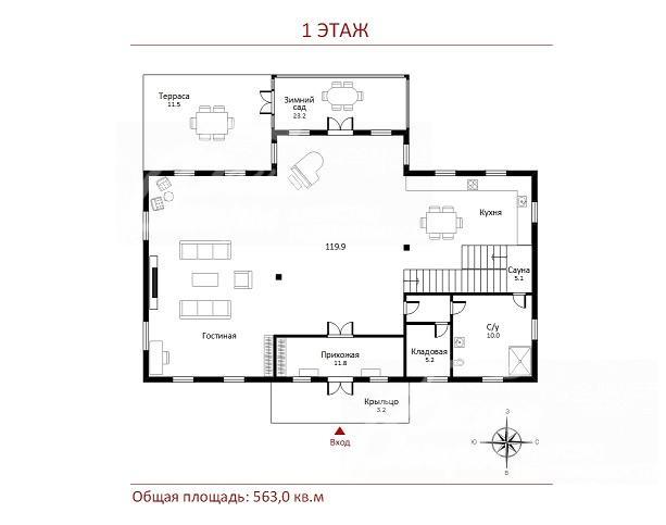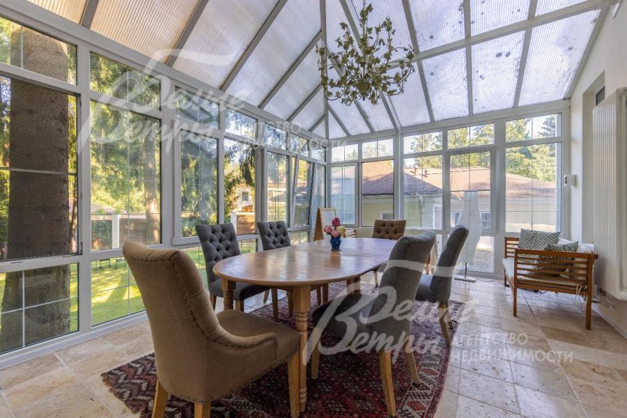 объединённая с гостиной - 119 кв.м, отапливаемый зимний сад 23 кв.м и просторная летняя терраса 11.5 кв.м с летней мебелью и выходом в сад, ванная комната 10 кв.м с сауной 5 кв.м, бочкой и гостевым санузлом.
