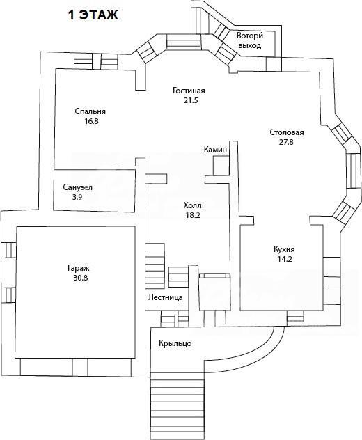 1-ый этаж: крыльцо, тамбур, просторный холл 18 кв.м, зона кухни 14 кв.м, столовая 28 кв.м, гостиная 22 кв.м с камином, спальня 17 кв.м, санузел 7 кв.м, гараж 31 кв.м на два машиноместа, холодный погреб 10 кв.м.