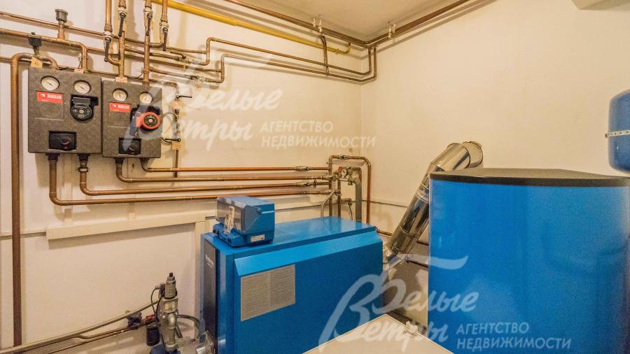 Инженерное обеспечение: в доме установлены газовый котел Buderus Logano g215 95 кВт, бойлер Buderus Logano 300 литров и система очистки воды Scientec. Естественная вентиляция. Видеонаблюдение охраны коттеджного поселка.
