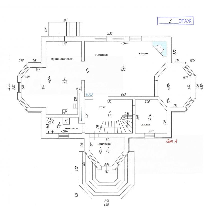 1-ый этаж: Крыльцо, прихожая 7 кв.м, холл 9 кв.м, котельная (с/узел) 4.5 кв.м, кухня-столовая с эркером и выходом на участок 27.6 кв.м, гостиная с угловым камином и зимним садом на подиуме с эркером 43 кв.м, кабинет 8 кв.м, кладовая