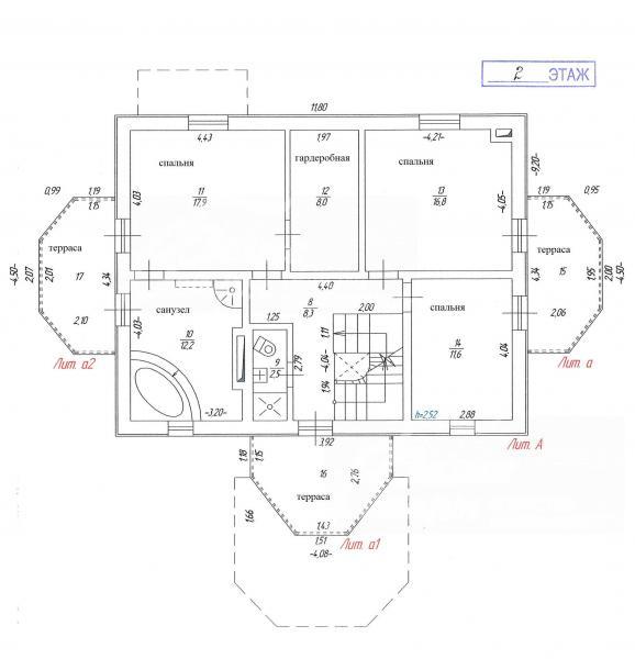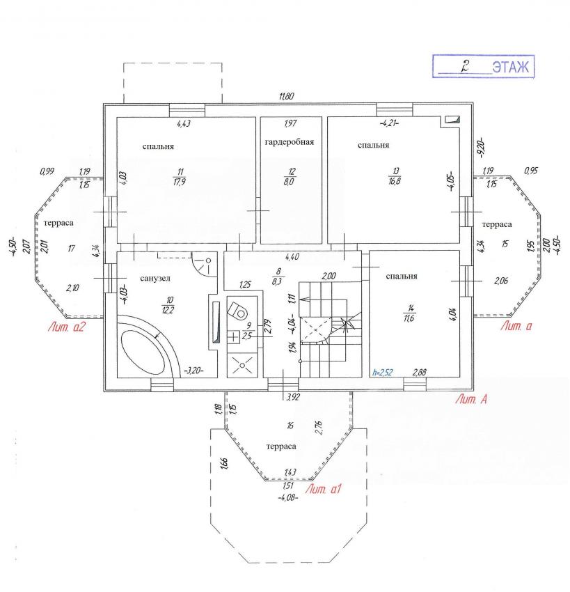 2-ой этаж: Коридор, санузел, главная спальня 18 кв.м с ванной 12 кв.м и гардеробной 8 кв.м, спальня 16.8 кв.м, гостевая 11.6 кв.м