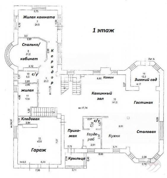 1-ый этаж: крыльцо, гараж на 2 авто 44 кв.м, прихожая с гардеробной 7 кв.м, гостевой с/узел 4 кв.м, каминный зал с выходом в зимний сад 12 кв.м, объединенный с кухней и столовой (общая площадь зала 141 кв.м), 3 жилых комнаты (13+21+25 кв.м), одна из которых имеет выход во двор (могут быть использованы в качестве гостевых спален или кабинета), c/узел 5 кв.м