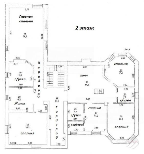 2-ой этаж: Главная спальня 57 кв.м, с/узел 16 кв.м, гардеробная 19 кв.м, две спальни 16 и 34 кв.м, каминный зал 45 кв.м, спальня 17 кв.м с собственным с/узлом и гардеробной, две спальни с эркерами 21 и 26 кв.м, с/узел 7 кв.м
