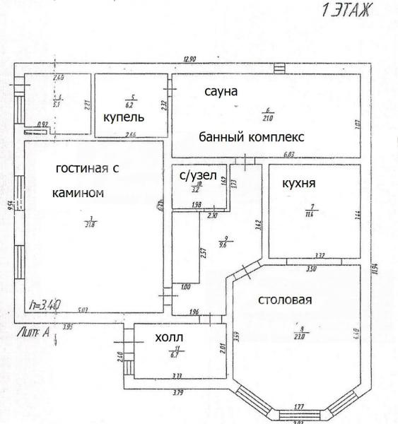 1-ый этаж: прихожая, гостиная с камином 30 кв.м, с/узел со стиральной машинкой, кухня-столовая 50 кв.м с кухонным гарнитуром и посудомоечной машинкой, банный комплекс с купелью, сауной и комнатой отдыха 40 кв.м, котельная с с/узлом и отдельным входом