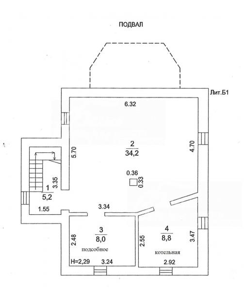 Цоколь: Подвал: коридор, свободное помещение 34.4 кв.м, котельная 8.8 кв.м, подсобное помещение 8 кв.м
