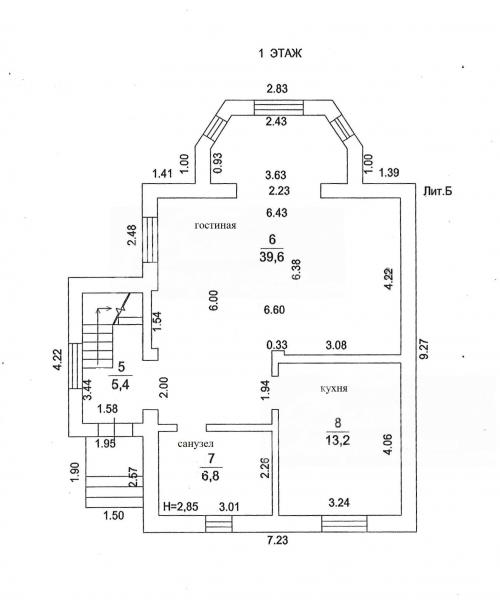 1-ый этаж: Коридор, гостиная 39.6 кв.м, кухня 13 кв.м, с/узел 6.8 кв.м