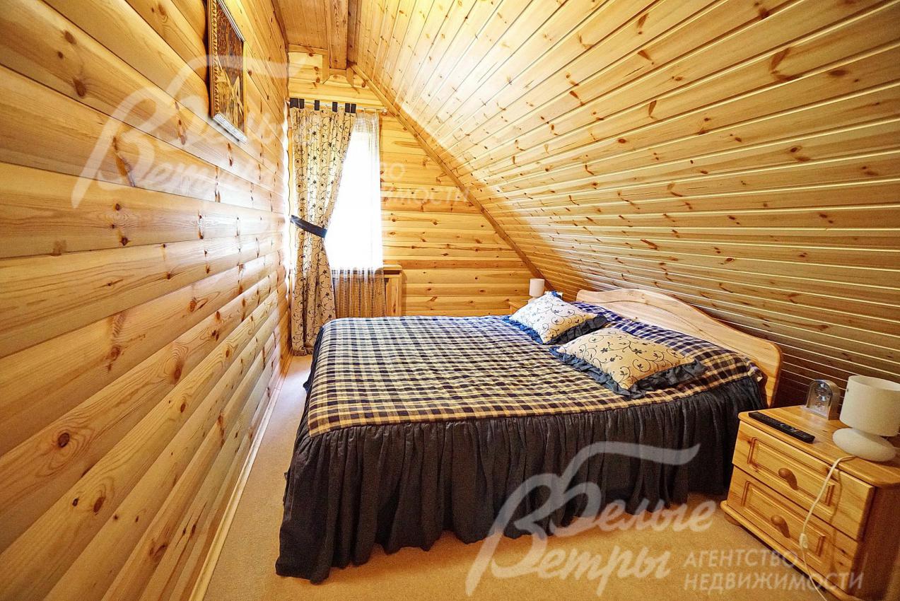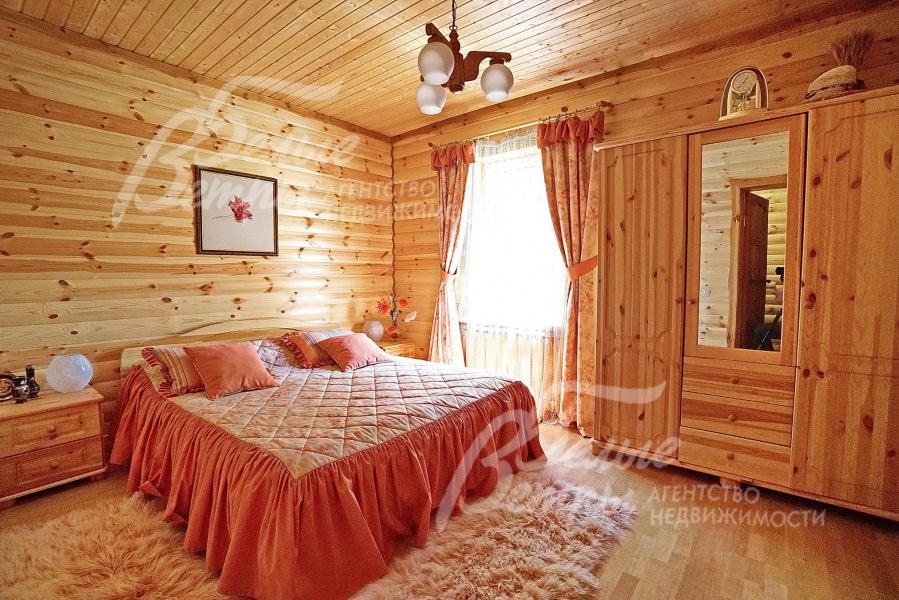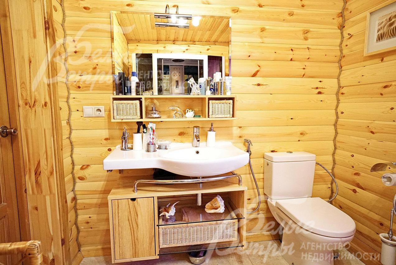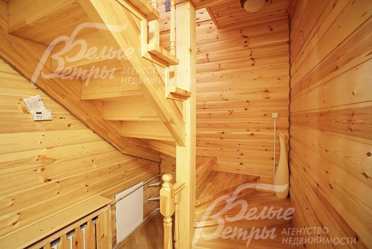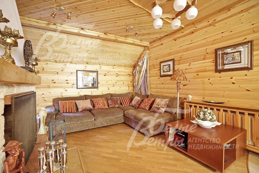 Описание внутренней отделки: Отделка в стиле деревянного дома, при этом современная, аккуратная с использованием материалов высокого класса. Во внутренней отделке использован блок-хаус, покрытый лаком. Полы в прихожей, кухонной зоне и с/у выложены плиткой с водяным подогревом. В остальных комнатах 1го этажа - инженерная шпонированная доска "Дуб". Полы 2го этажа покрыты ковролином. Деревянная лестница "Лиственница". Потолки отделаны вагонкой (хвоя). Вся сантехника фирмы Laufen (Швейцария). Ванная-душевая с гидромассажем и радио. Коммуникации разведены, радиаторы стальные Kermi, э/э Legrand. Двери дерево массив (хвоя). Подоконники деревянные (лиственница)