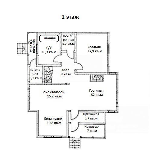 1-ый этаж: Крыльцо 7 кв.м, прихожая 6 кв.м, гостиная с камином 32 кв.м, столовая зона 15 кв.м, кухонная зона 11 кв.м, лестничный холл 9 кв.м, спальня 18 кв.м, с/у с ванной-душевой 10 кв.м, постирочная 3 кв.м, котельная с отдельным входом 3 кв.м.