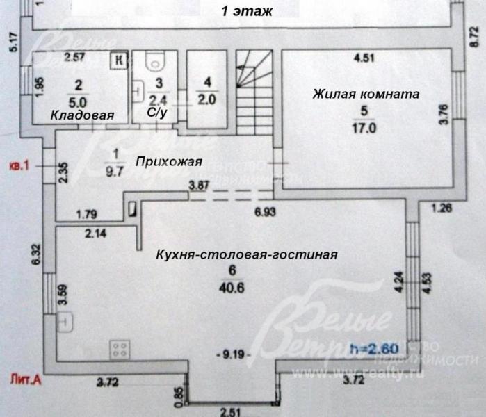 1-ый этаж: прихожая 10 кв.м, кладовая (гардероб) 5 кв.м, с/узел, кухня-столовая-гостиная 40,6 кв.м, с/узел, жилая комната 17 кв.м
