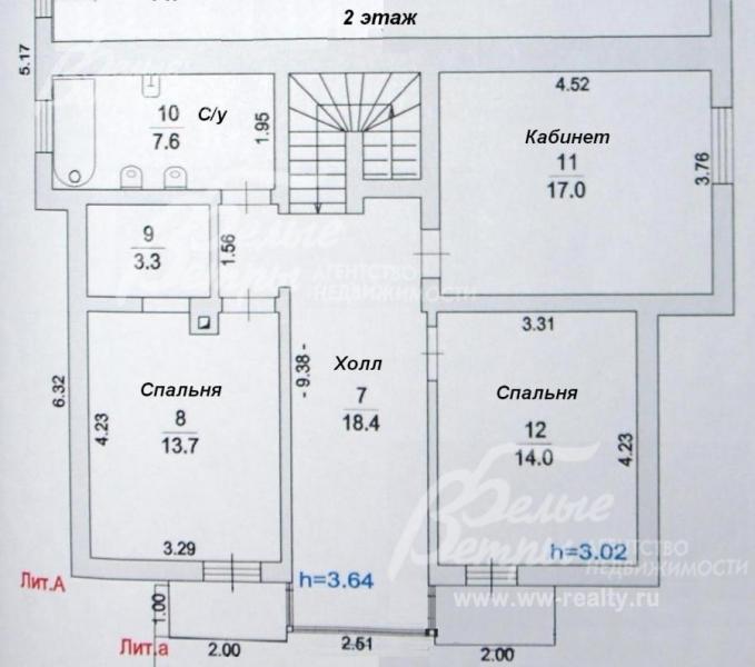 2-ой этаж: холл 19 кв.м, спальня 13,7 кв.м с балконом, спальня 14 кв.м с балконом, кабинет 17 кв.м, с/узел с биде 7,6 кв.м