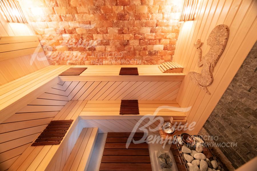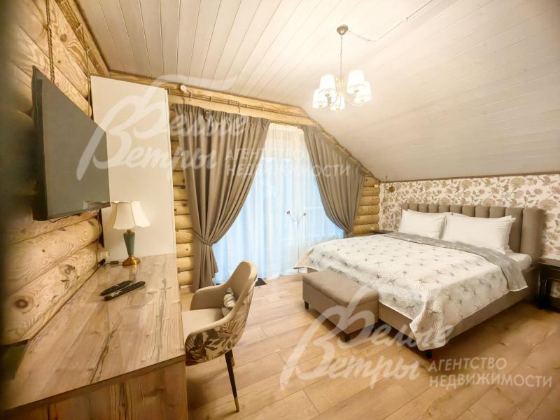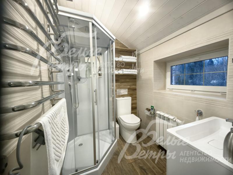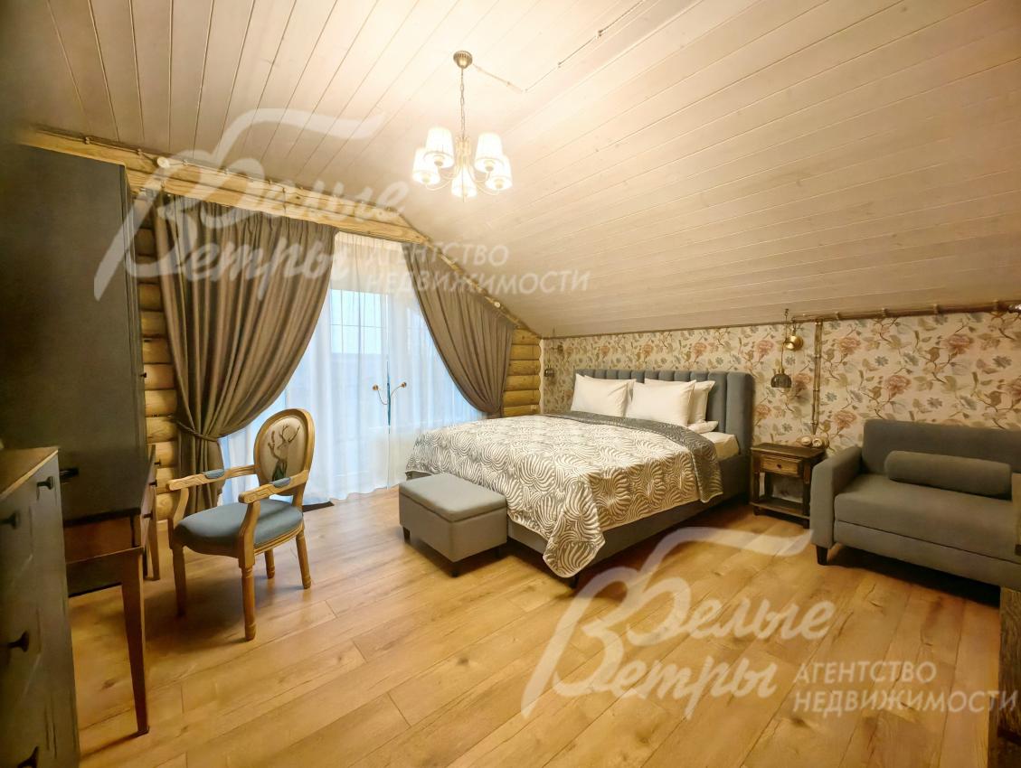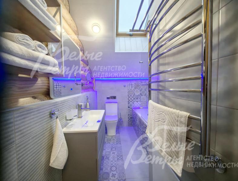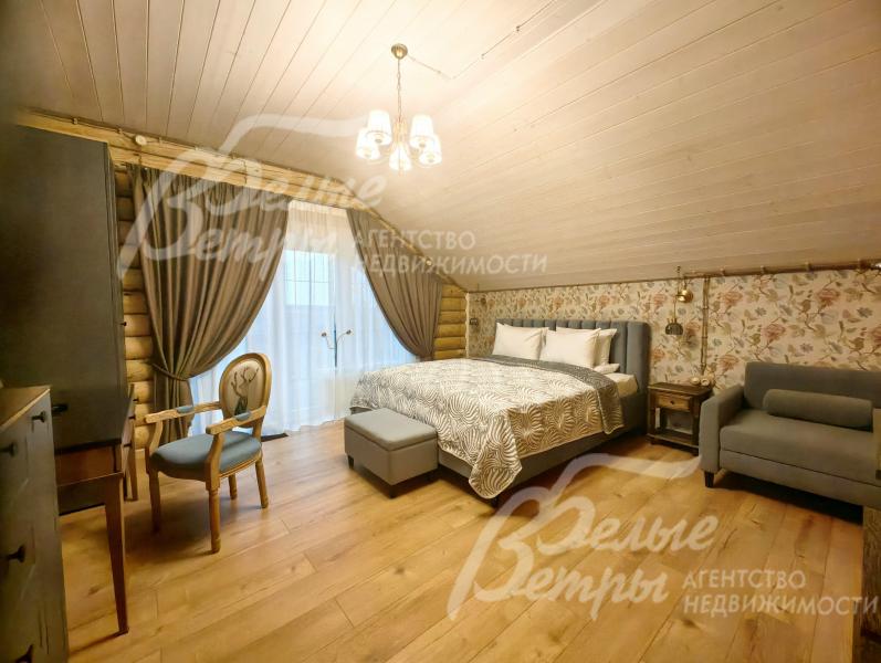 Описание внутренней отделки: стильная отделка в современные пастельных тонах: стены 2-го этажа - бревно и обои, высокие потолки, много света, ярких элементов интерьера. Окна второго этажа в доме панорамные и мансардные. В санузлах - плитка до потолка и бревно. Двери филенчатые белого цвета. Качественная стильная сантехника, большие душевые кабины с трапами.