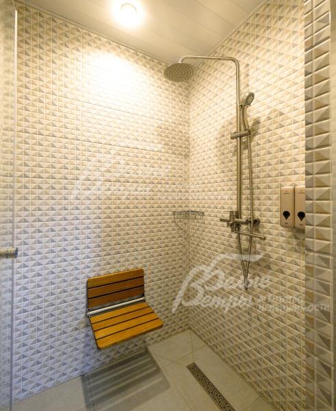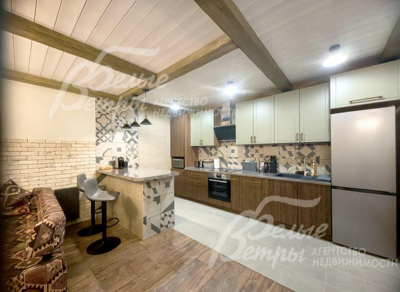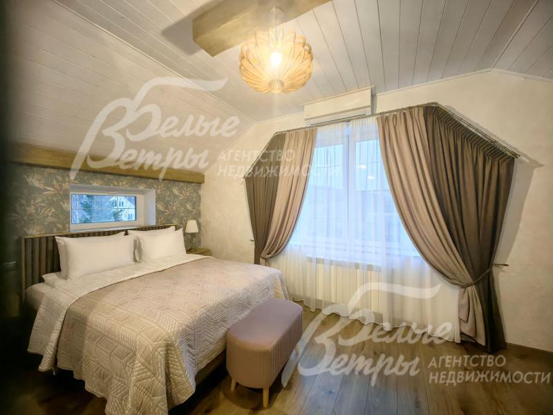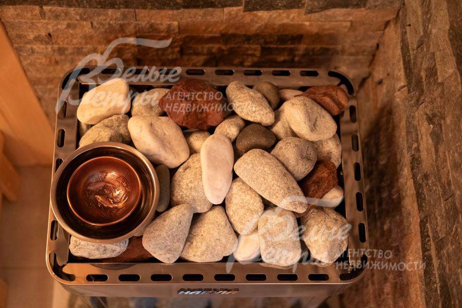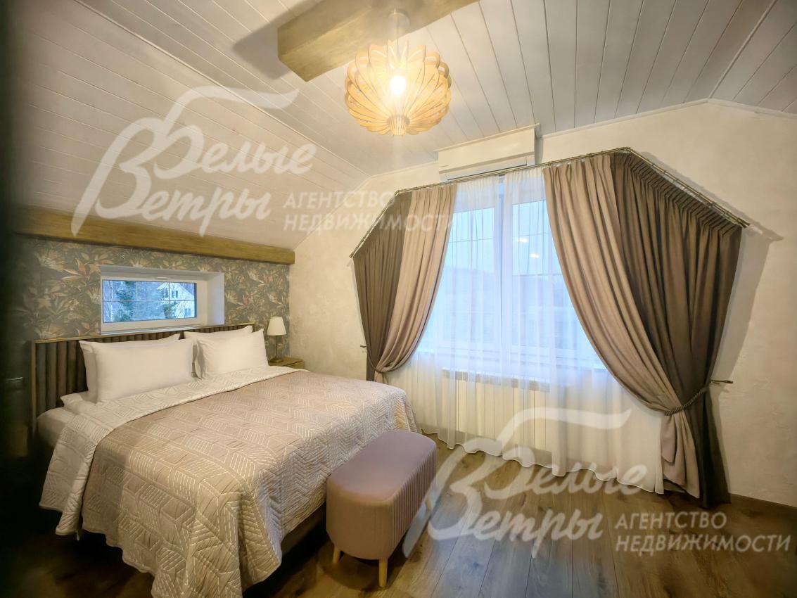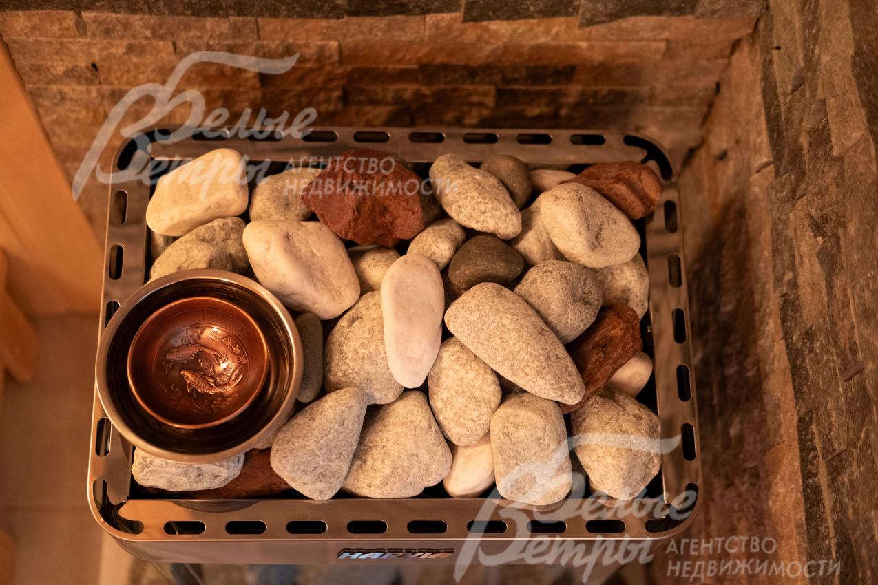 Описание внутренней отделки: стильная отделка в современные пастельных тонах: стены 2-го этажа - бревно и обои, высокие потолки, много света, ярких элементов интерьера. Окна второго этажа в доме панорамные и мансардные. В санузлах - плитка до потолка и бревно. Двери филенчатые белого цвета. Качественная стильная сантехника, большие душевые кабины с трапами.