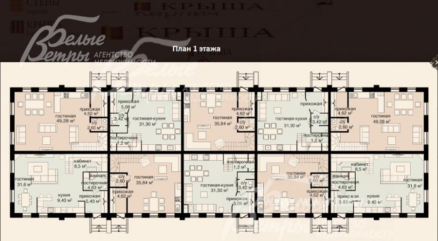 Описание внутренней отделки: отделка в стиле хай-тек, полы выложены дорогой итальянской плиткой, подогрев пола может быть полным и зональным, подвесной потолок с подсветкой, в санузлах швейцарская и немецкая сантехника, лестница с деревянными ступеньками