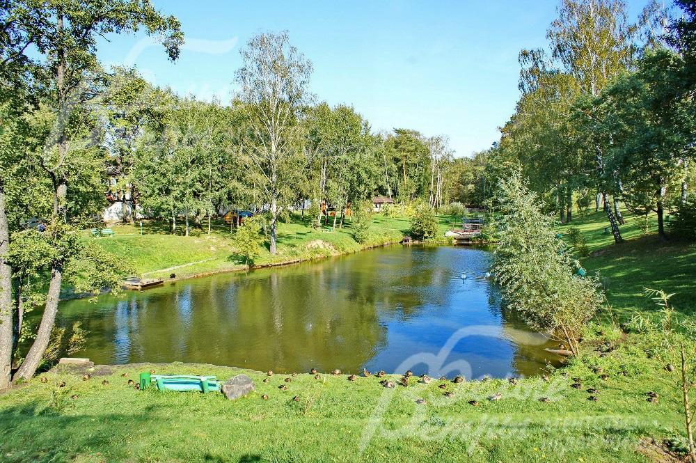 Живописный пруд с зоной отдыха в поселке.