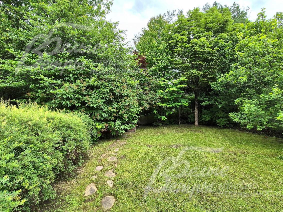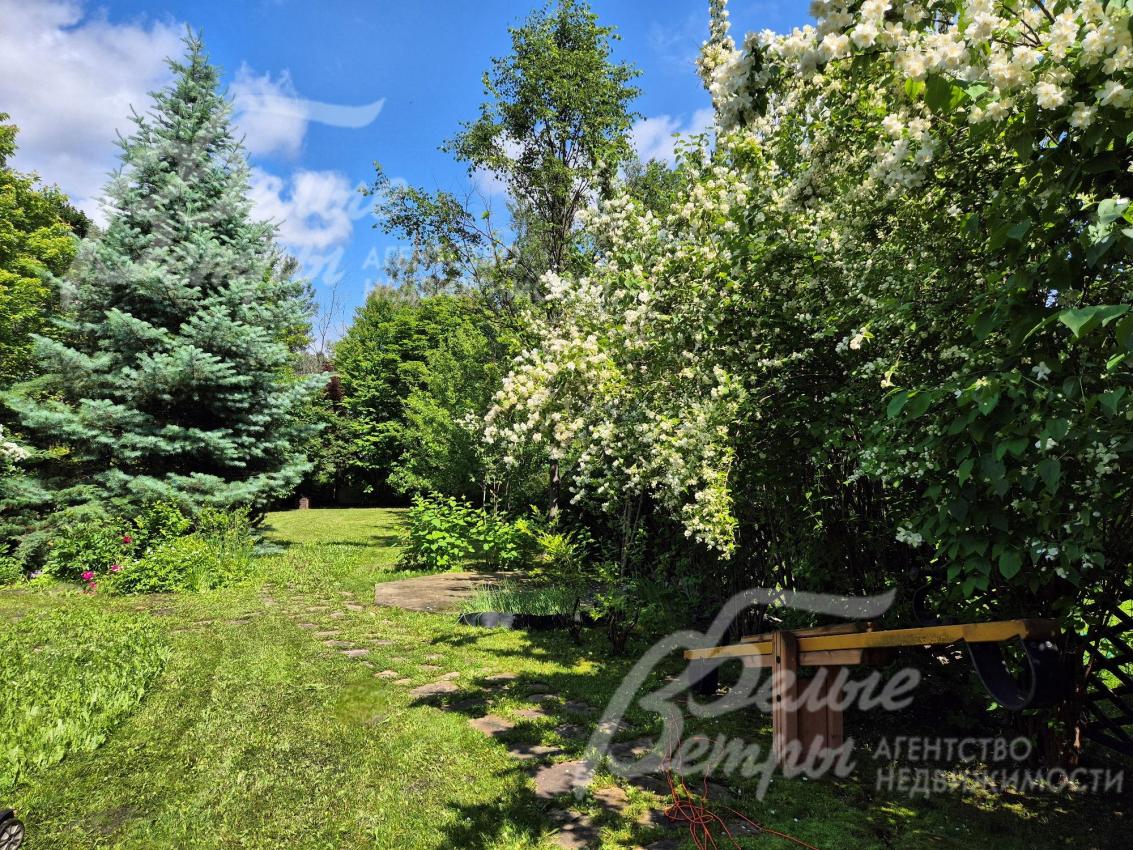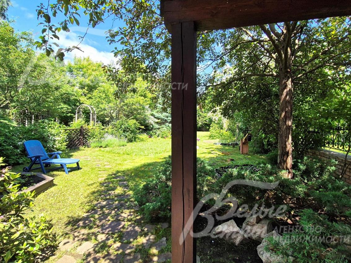 Благоустроенный участок со взрослыми лесными и декоративными деревьями и растениями.