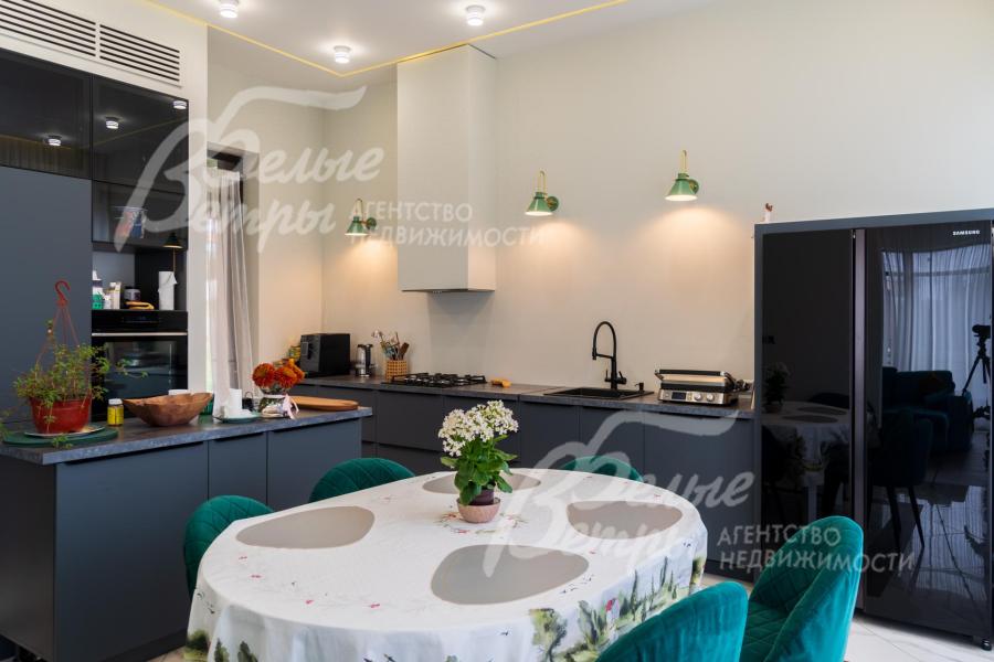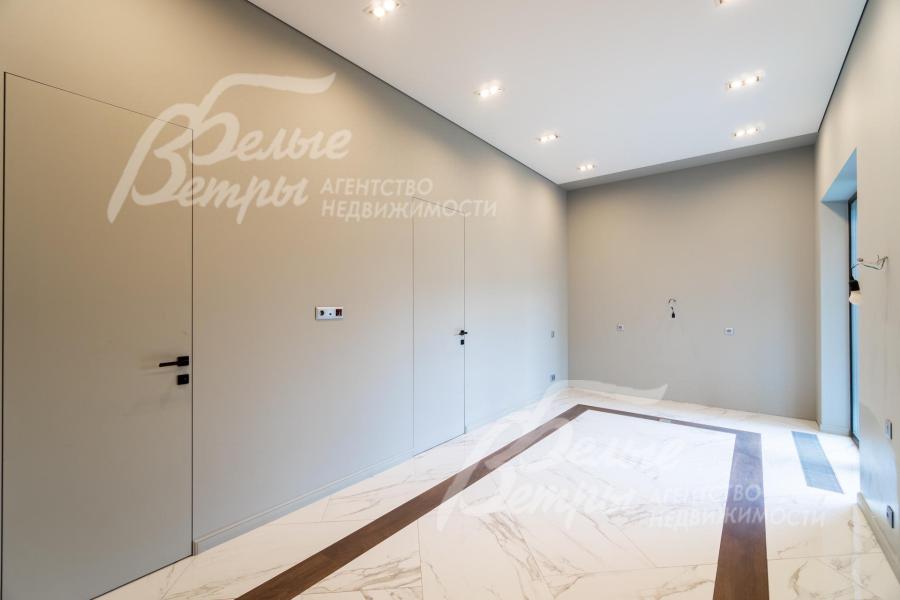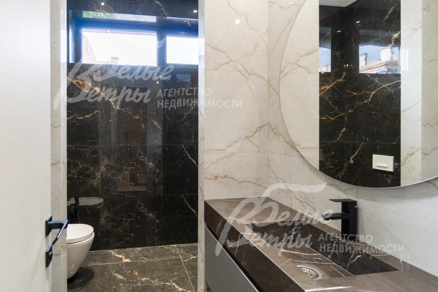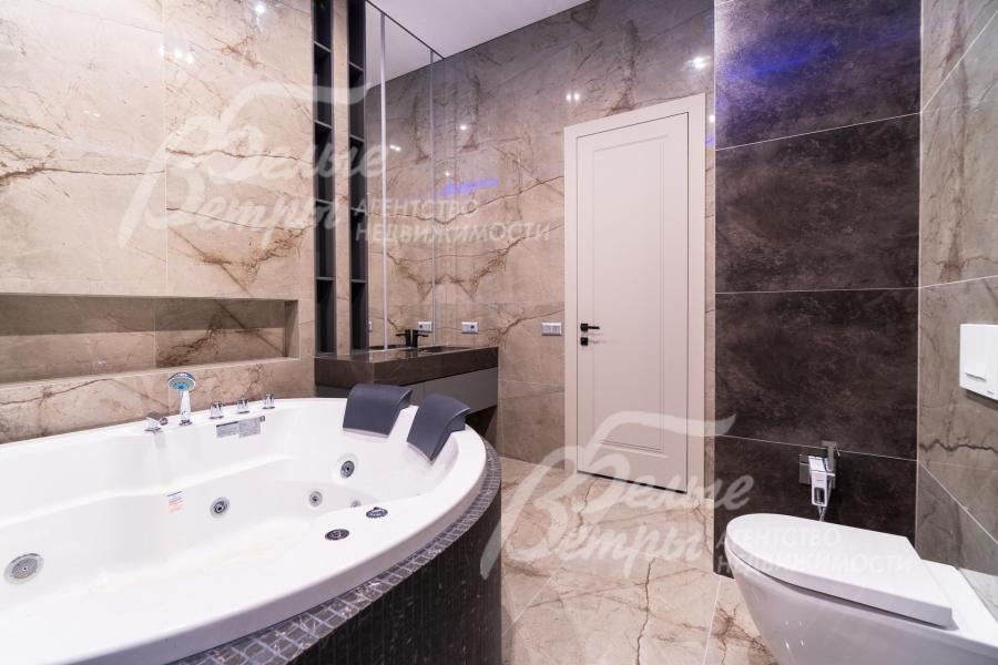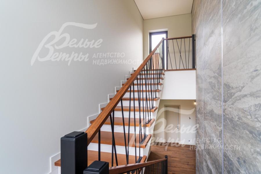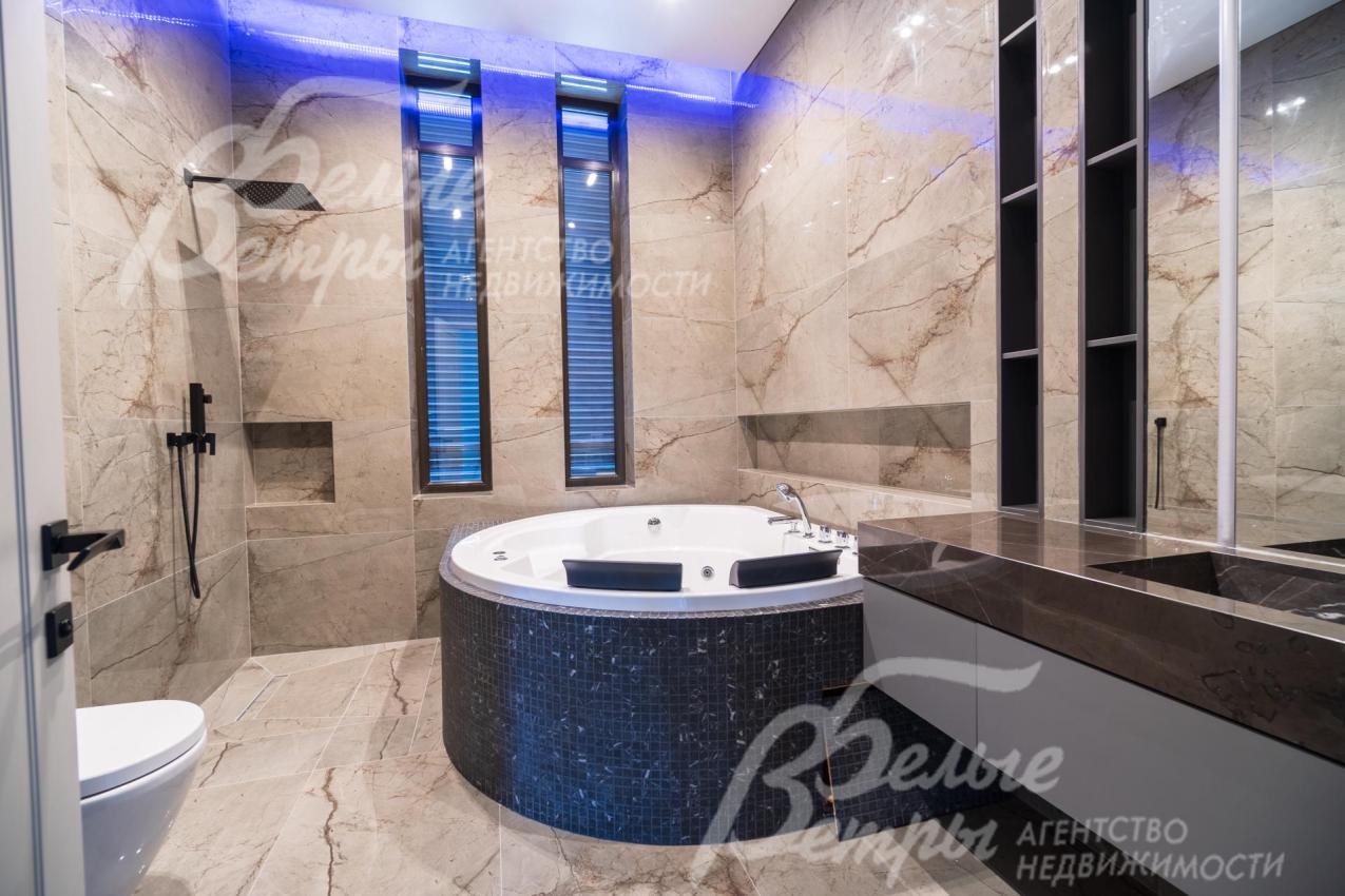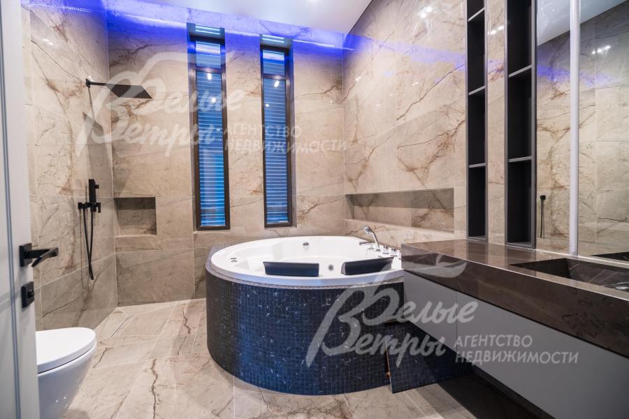 Описание внутренней отделки: Дизайнерская отделка в стиле Современный Модерн. На стенах декоративная штукатурка, окраска, в санузлах - плитка Laparet. В отделке использованы дизайнерские элементы из дерева, 3D элементы, различные ниши со скрытой подсветкой, зеркала и т.д. На полу керамогранит с водяным подогревом (все санузлы, прихожая, холл, зона кухни и зона гостиной); паркетная дубовая доска - все спальни и холл второго этажа. Потолки подвесные ГКЛ разноуровневые и натяжные (французские) с дизайнерскими элементами и различной подсветкой (скрытая светодиодная, точечные споты, движущиеся споты на рейлингах, люстры). Вся сантехника от ведущих брендов. Душевые со встроенной системой слива в пол и со стеклянными дверцами. Все коммуникации разведены, конвекторы встроенные польные, электрика АВВ (Германия). Двери деревянные эмалированные и двери скрытого монтажа высотой 2.3 м, подоконники из массива ореха.