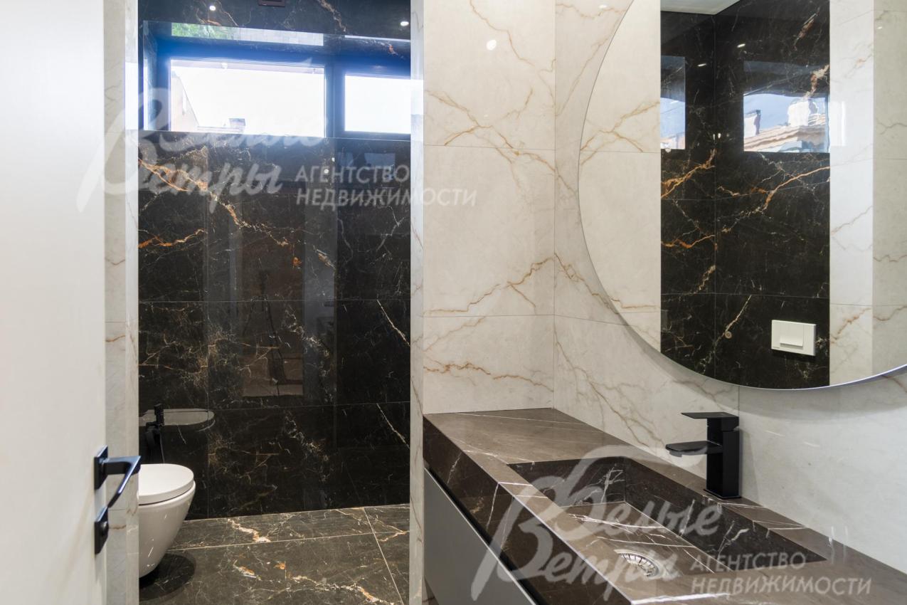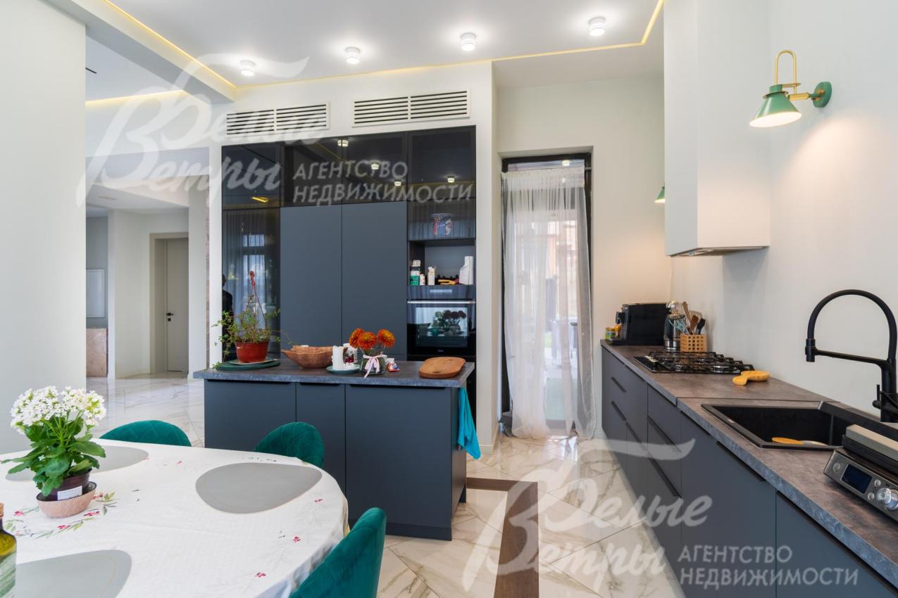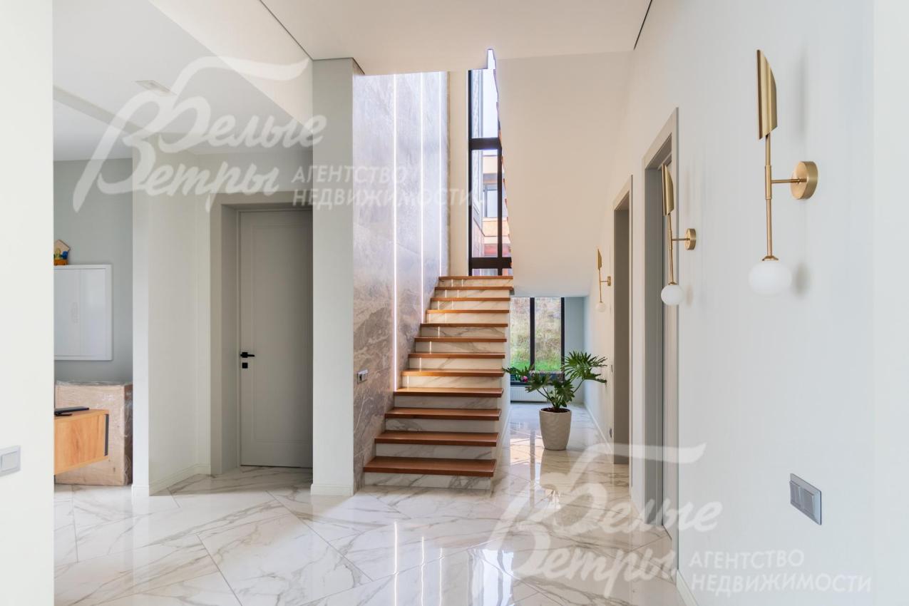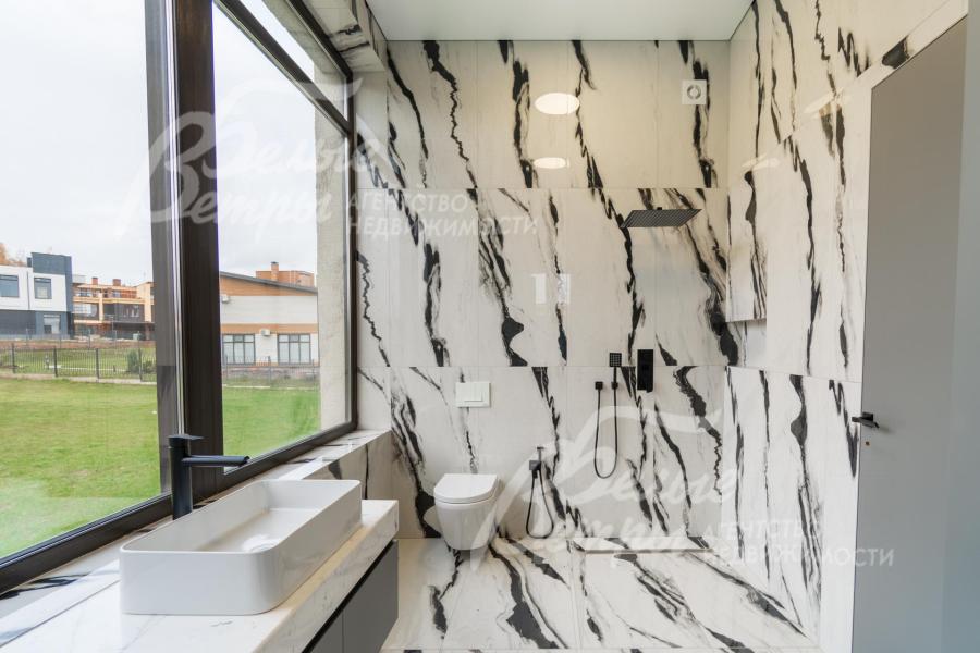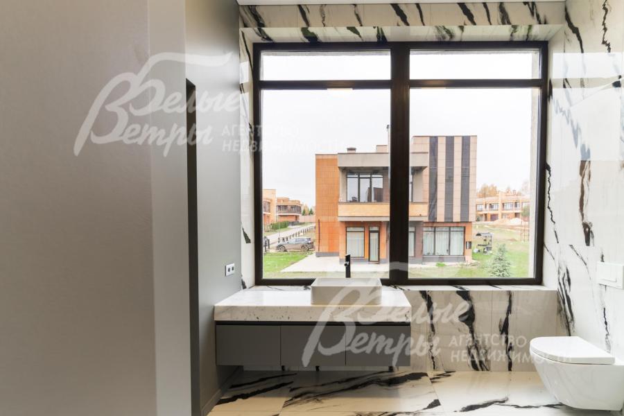 Описание внутренней отделки: Дизайнерская отделка в стиле Современный Модерн. На стенах декоративная штукатурка, окраска, в санузлах - плитка Laparet. В отделке использованы дизайнерские элементы из дерева, 3D элементы, различные ниши со скрытой подсветкой, зеркала и т.д. На полу керамогранит с водяным подогревом (все санузлы, прихожая, холл, зона кухни и зона гостиной); паркетная дубовая доска - все спальни и холл второго этажа. Потолки подвесные ГКЛ разноуровневые и натяжные (французские) с дизайнерскими элементами и различной подсветкой (скрытая светодиодная, точечные споты, движущиеся споты на рейлингах, люстры). Вся сантехника от ведущих брендов. Душевые со встроенной системой слива в пол и со стеклянными дверцами. Все коммуникации разведены, конвекторы встроенные польные, электрика АВВ (Германия). Двери деревянные эмалированные и двери скрытого монтажа высотой 2.3 м, подоконники из массива ореха.