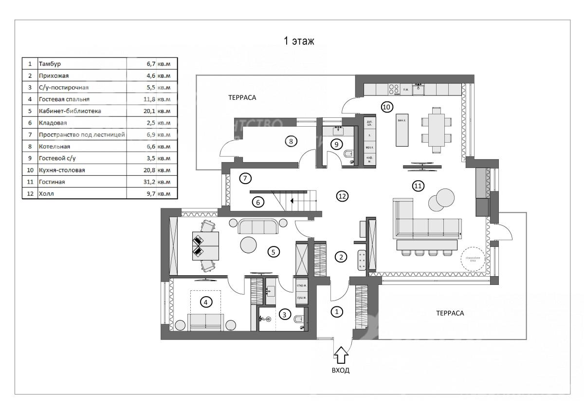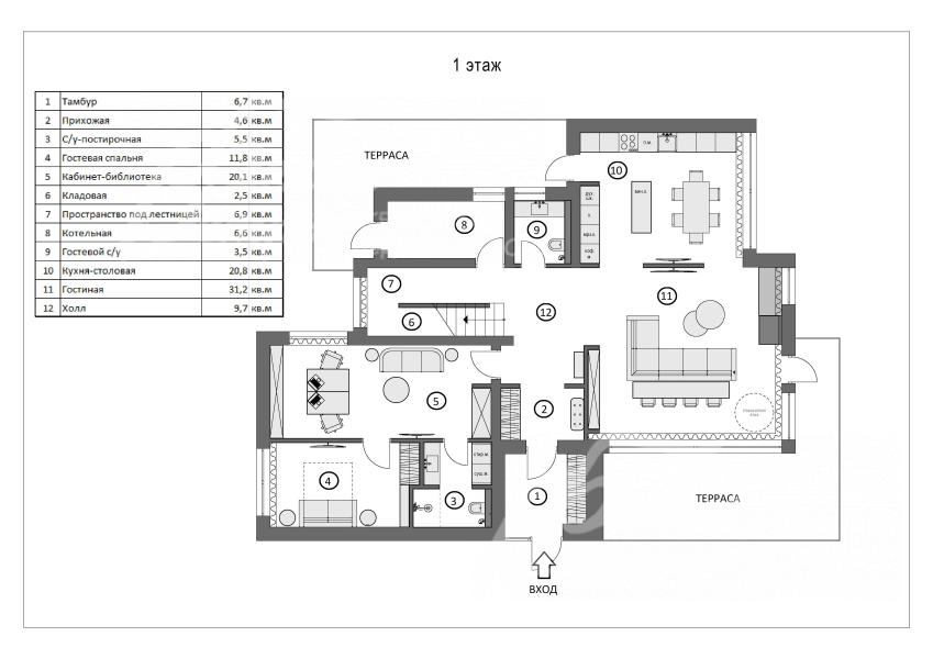 1-ый этаж: тамбур 7 кв.м, прихожая 5 кв.м, холл 10 кв.м, зона гостиной 31 кв.м с выходом на террасу, зона кухни-столовой 21 кв.м с выходом на террасу, кабинет-библиотека 20 кв.м, гостевая спальня 12 кв.м, санузел-постирочная 6 кв.м с душевой, кладовая 3 кв.м, пространство под лестницей 7 кв.м, общий санузел (1/2) 4 кв.м, котельная 7 кв.м с отдельным входом.