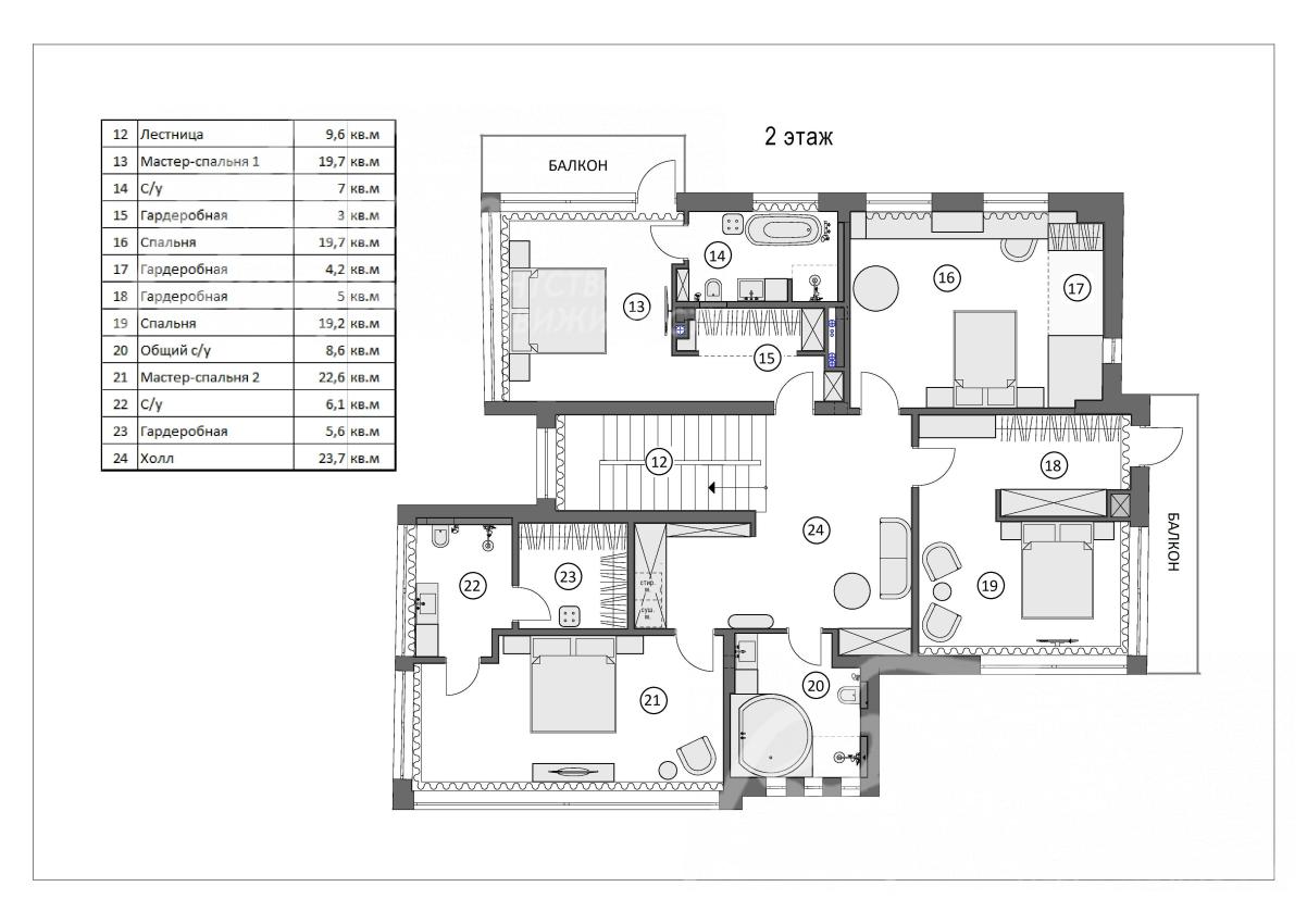 2-ой этаж: холл 24 кв.м, спальня 20 кв.м с гардеробной 4 кв.м, спальня 19 кв.м с гардеробной 5 кв.м с выходом на балкон, общий санузел 9 кв.м (душ и ванная), мастер-спальня 23 кв.м с санузлом 6 кв.м (душ) и с гардеробной 6 кв.м, мастер-спальня 20 кв.м с санузлом 7 кв.м (душ и ванная) с гардеробной 3 кв.м и с выходом на балкон.