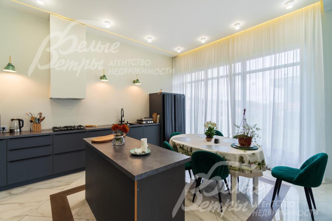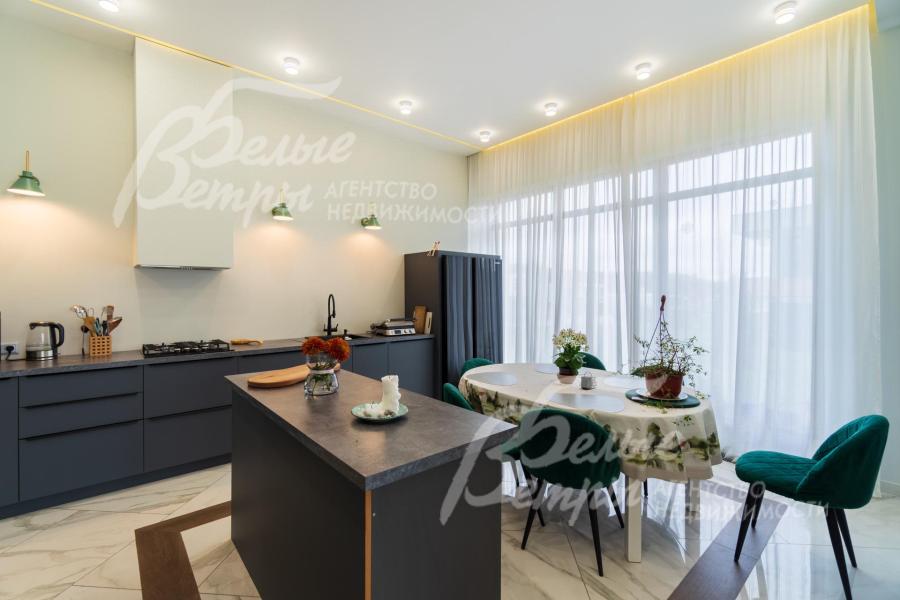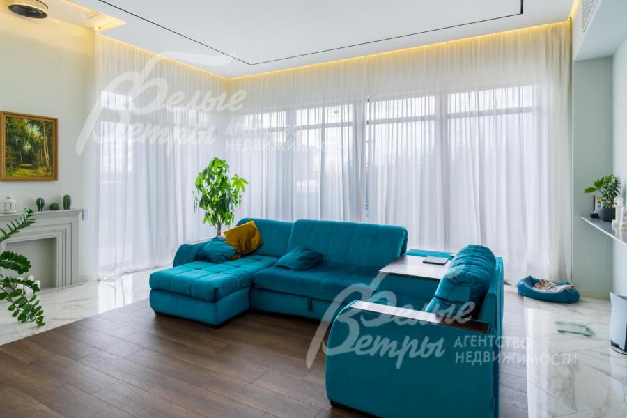 Мебель, оборудование: кухонный гарнитур с островом, эмалированные фасады из МДФ, столешница из искусственного камня. Вся необходимая встроенная техника: газовая варочная панель, духовой шкаф, двухдверный холодильник Side-by-Side, посудомоечная машина, стиральная машина, в гостиной большой современный телевизор. В столовой обеденная группа на 6 персон с мягкими креслами, в гостиной П-образный раскладной диван с обивкой из велюра. Возможно будет дополнить мебель под арендатора. В гостиной панорамное остекление закрыто тюлем. Установлена скрытая светодиодная подсветка, точечные споты, движущиеся споты на рейлингах, люстры.