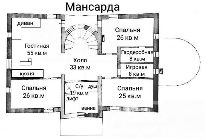 3-ий этаж: холл 33 кв м, лифт, гостиная 55 кв.м с установленной кухней и столом со стульями и с диваном, совмещенная с кухней и рабочим местом, 3 спальни примерно по 26 кв.м каждая, гардеробная 8 кв.м, игровая комната 8 кв.м.