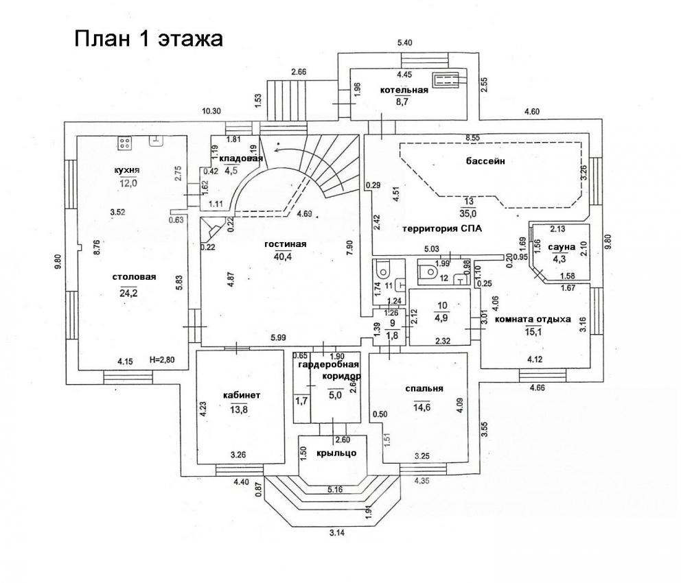 1-ый этаж: тамбур 5 кв.м, гостиная с камином 40.4 кв.м, кухня-столовая 36 кв.м, кладовая 4.5 кв.м, кабинет 13.8 кв.м, постирочная 15.1 кв.м, СПА зона: коридор, тамбур, с/у, комната отдыха 15.1 кв.м, с/у, парная с парогенератором, бассейн, котельная с выходом в сад