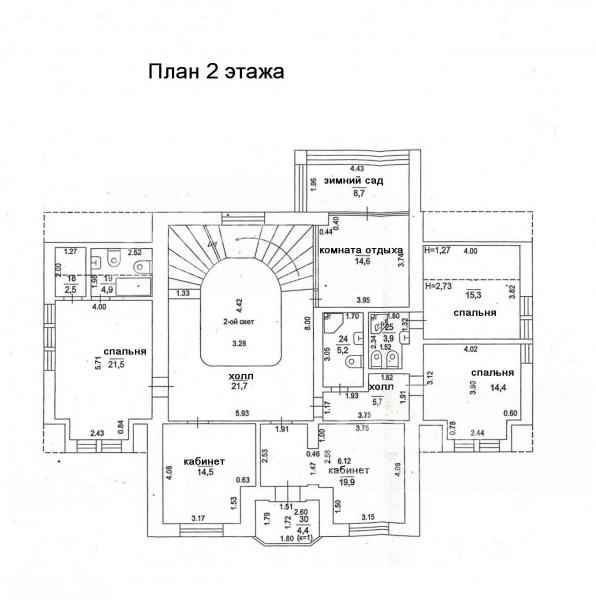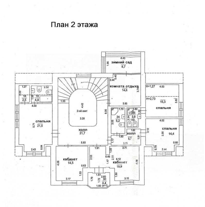 2-ой этаж: холл 21.7 кв.м, спальня 21.5 кв.м с с/у 4.9 и гардеробной 2.5 кв.м, кабинет 14.5 кв.м, кабинет с балконом 4.4 кв.м, с/у 5.2 кв.м, коридор 5.7 кв.м, спальня 14.4 кв.м, спальня 15.3 кв.м с с/у 3.9 кв.м, комната 14.6 кв.м с зимним садом 8.7 кв.м