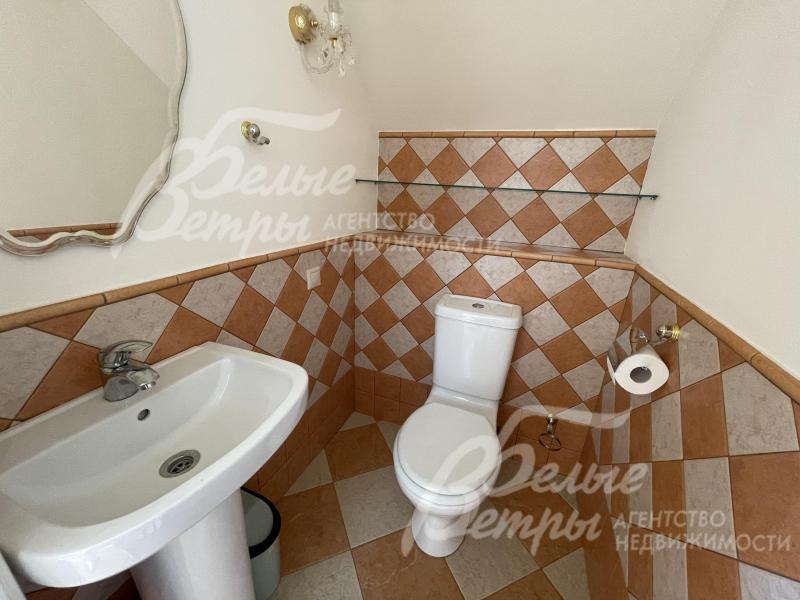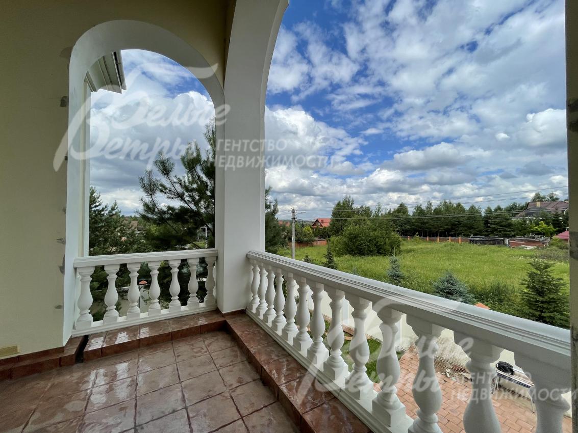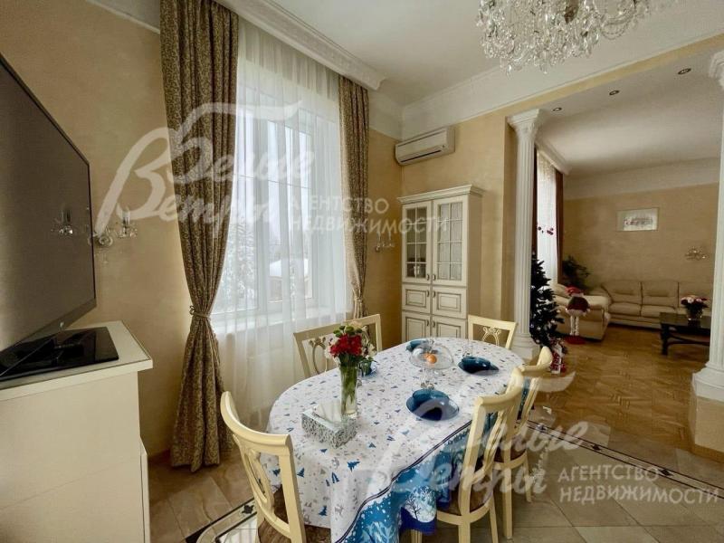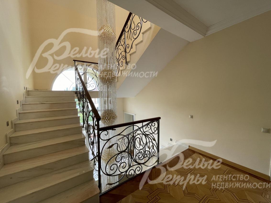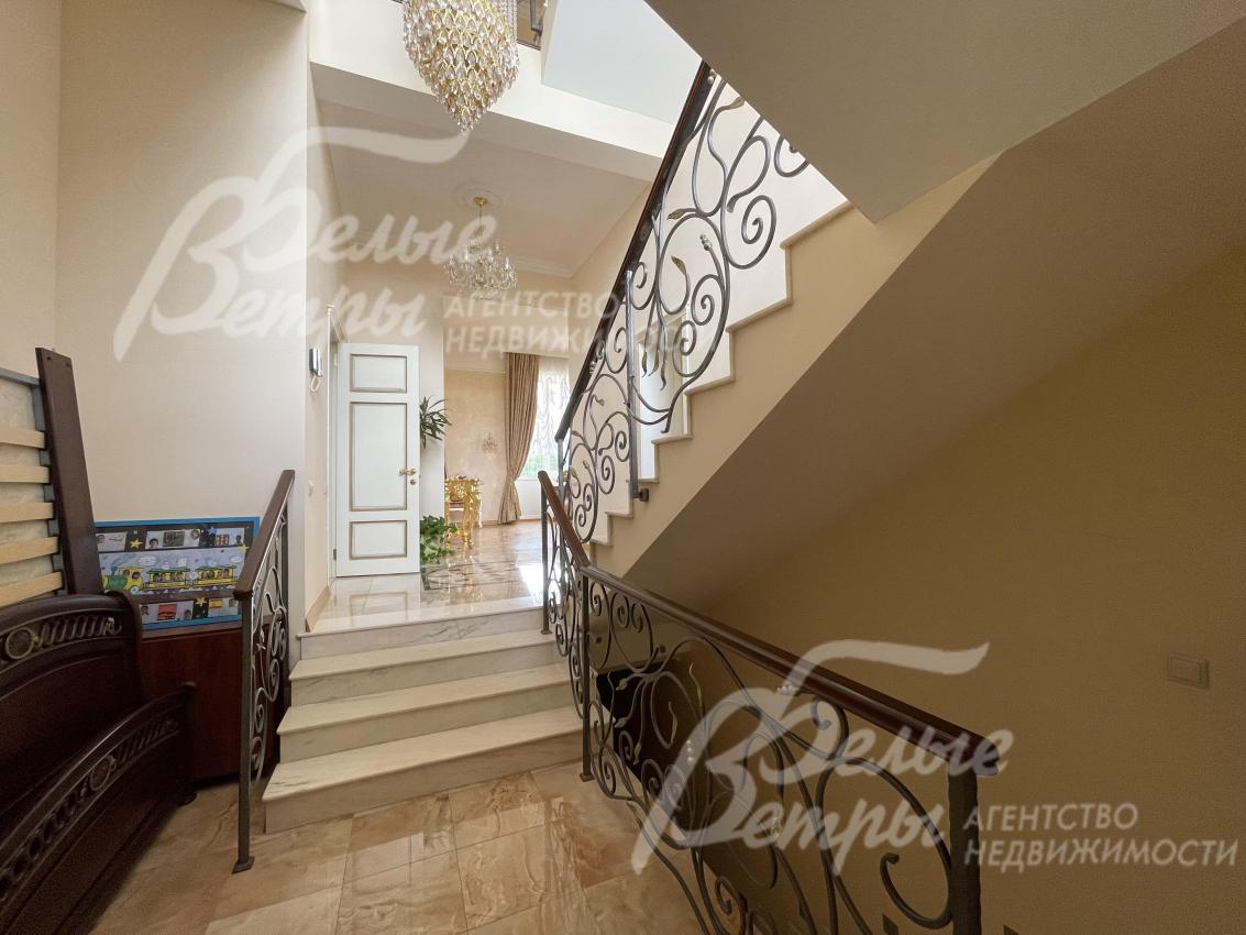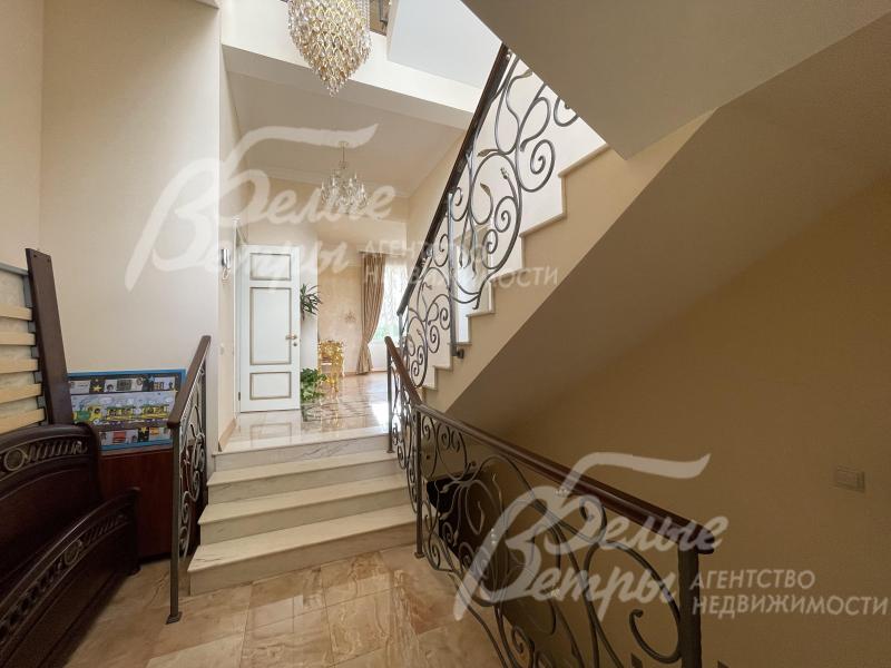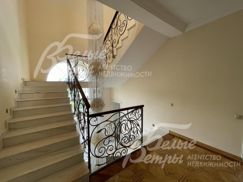 Описание внутренней отделки: выполнена отделка дорогими материалами в классическом стиле: многоуровневые потолки и сложные потолочные карнизы, колонны с каннелюрами, импортная плитка со множеством декора, лестница и три камина облицованы мрамором, штучный и наборный паркет из массива дуба. Многометровая люстра и французские шторы. Все три камина отделаны разными видами мрамора, особенно впечатляет розовый мрамор камина в Гостиной. На полах дорогой наборный паркет из дуба. На кухне испанская плитка, выложенная мозаикой, идеально сочетается с классической кухней. В доме множество точек света, при этом очень большие окна, что дополнительно расширяет пространство.