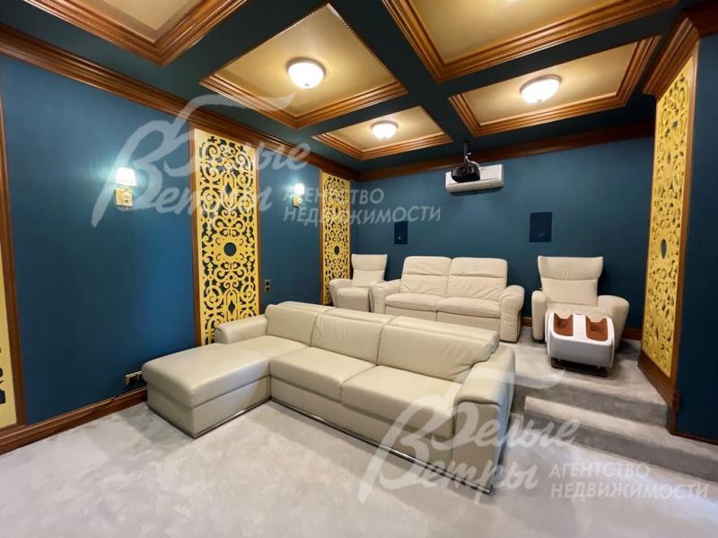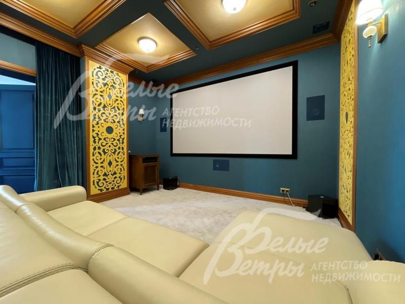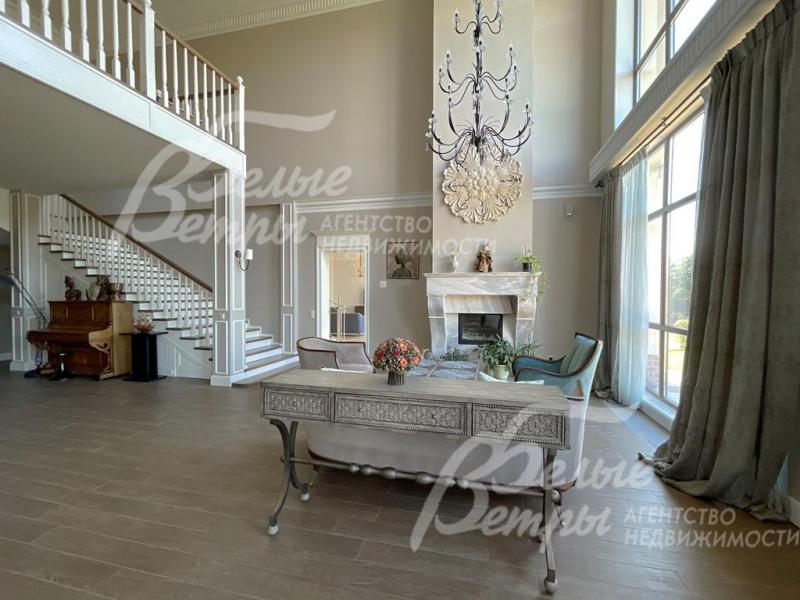 Описание внутренней отделки: выполнена дорогая, качественная отделка современными материалами Премиум класса. На стенах венецианская и фактурная штукатурка, декоративная покраска, плитка. На полах паркетная доска, в коридорах керамическая плитка, в кинозале на полу ковролин. Потолки двухуровневые. Камин отделан мрамором. Двери из массива дерева, в гостиных - с остеклением.