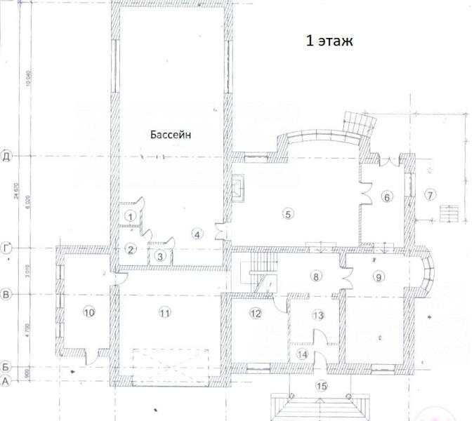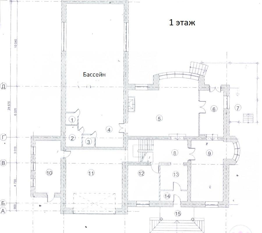 1-ый этаж: прихожая, холл, кабинет/гостевая, спальня, каминный зал, кухня-столовая, второй свет, санузел, постирочная, бассейн, сауна, душевая, санузел