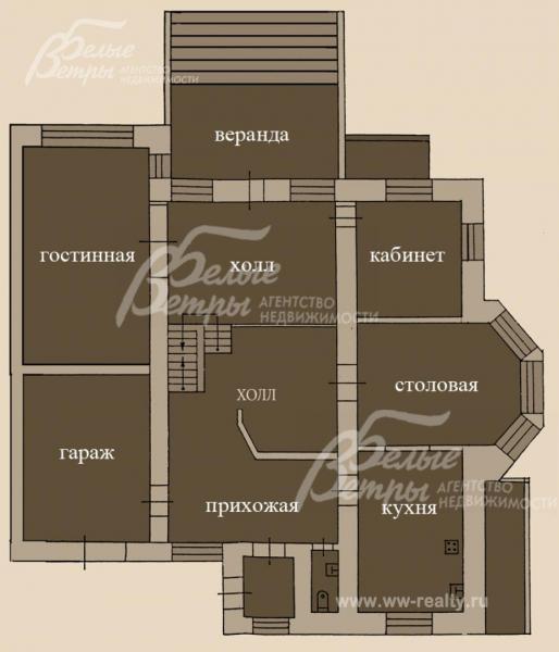 1-ый этаж: прихожая, холл, гостиная, кабинет, кухня-столовая, веранда, гараж.