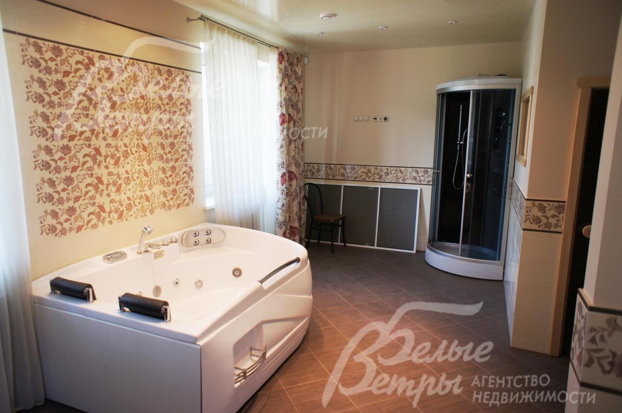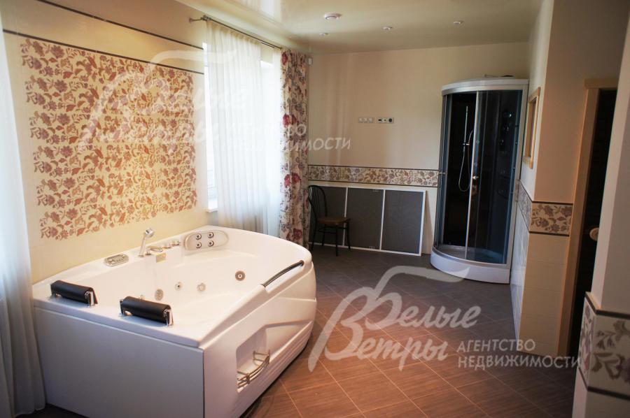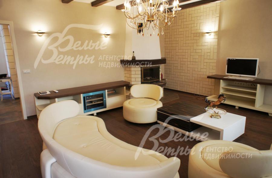 Описание внутренней отделки: Выполнена качественная отделка: стены оклеены обоями, в холле и гостиной на стенах декор под камень. Пол - паркетная доска, плитка с подогревом. Потолки подвесные со встроенной подсветкой, в гостиной потолок декорирован деревянными балками. В холле 2го этажа на стене декоративная фреска.