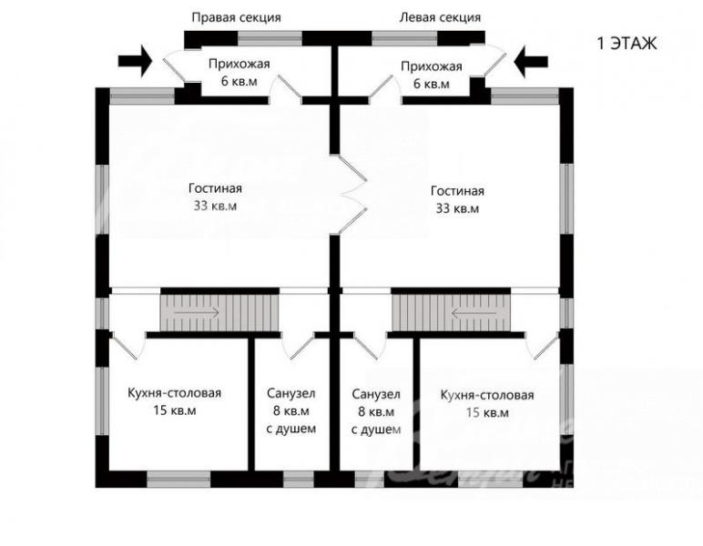 правая секция: прихожая 6 кв.м, гостиная 33 кв.м, кухня/столовая 15 кв.м, санузел 8 кв.м с душевой.