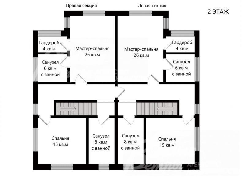 правая секция: мастер-спальня 22 кв.м с гардеробной 4 кв.м и санузлом 6 кв.м с ванной, спальня 15 кв.м, холл 10 кв.м, санузел 8 кв.м с ванной.