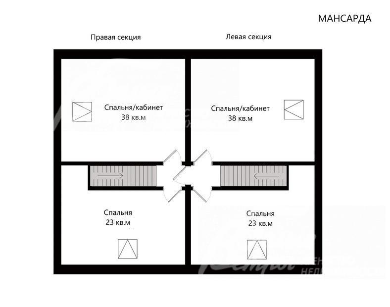 3-ий этаж: левая секция: спальня 23 кв.м, спальня/кабинет 38 кв.м;