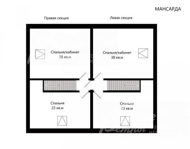 правая секция: спальня 23 кв.м, спальня/кабинет 38 кв.м.