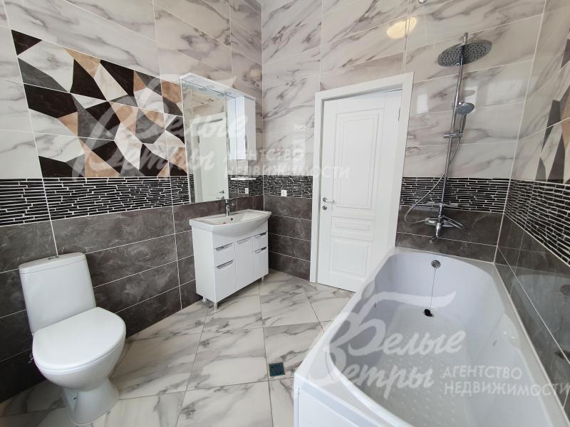 Описание внутренней отделки: выполнена стильная современная отделка с декоративной штукатуркой "мокрый шелк" и керамогранитом. Потолки: гипсокартонные со встроенным освещением, в гостиной - сложные, многоуровневые. Полы в гостиной, на кухне, в санузлах и на цоколе - керамогранит под белый мрамор с подогревом, в спальнях - ламинатная доска. Стены в санузлах и на цоколе - плитка; в гостиной, спальнях и на кухне - декоративная штукатурка с эффектом "мокрый шелк".