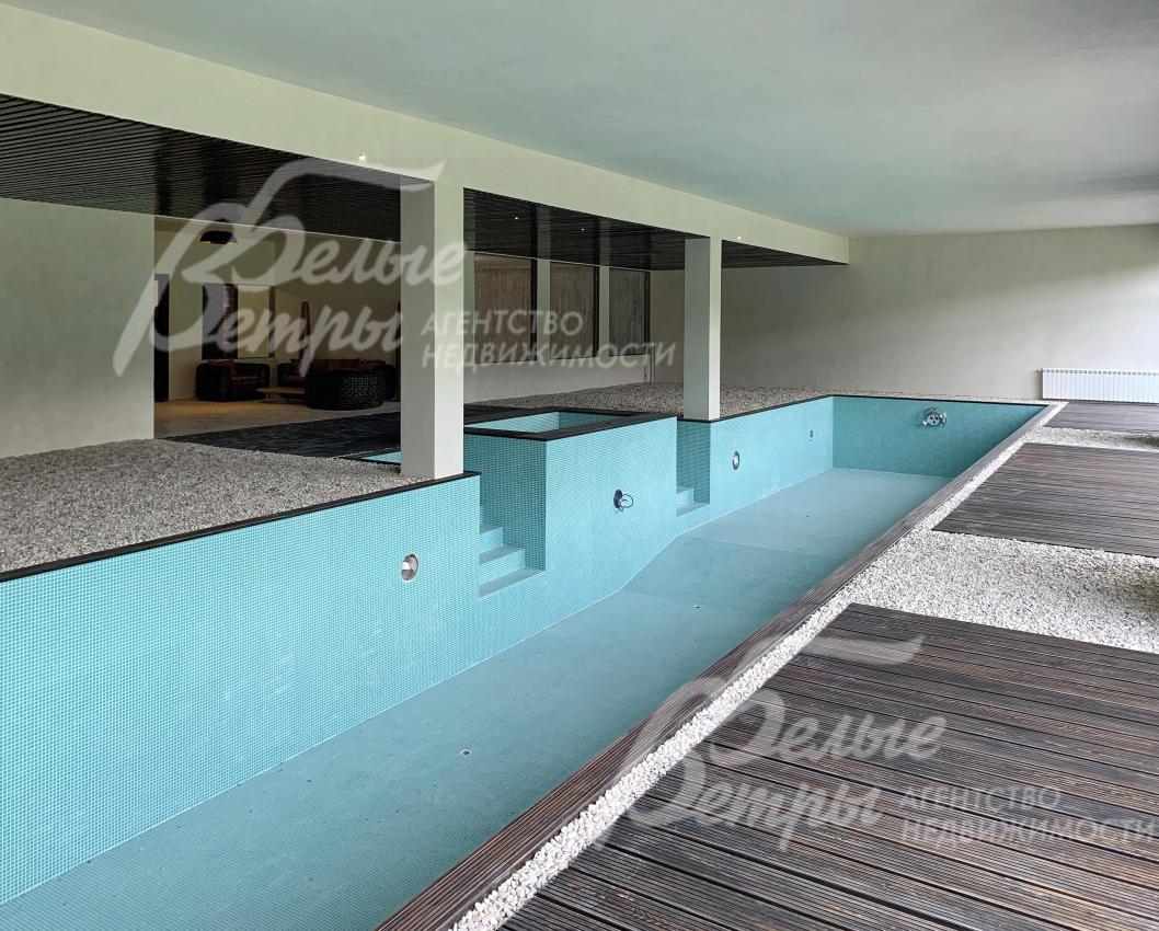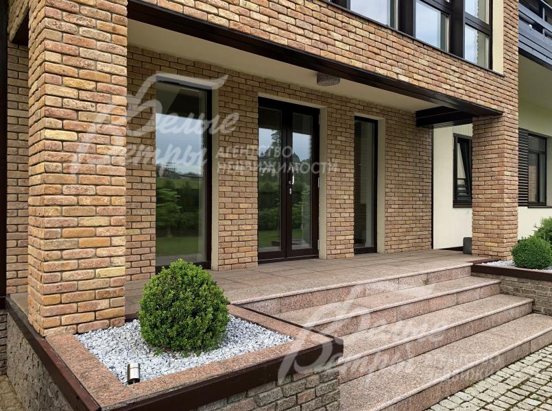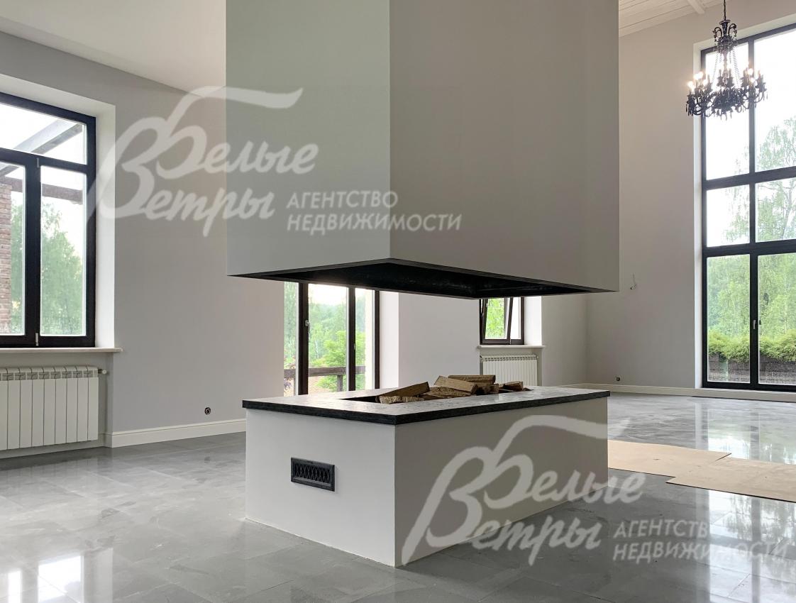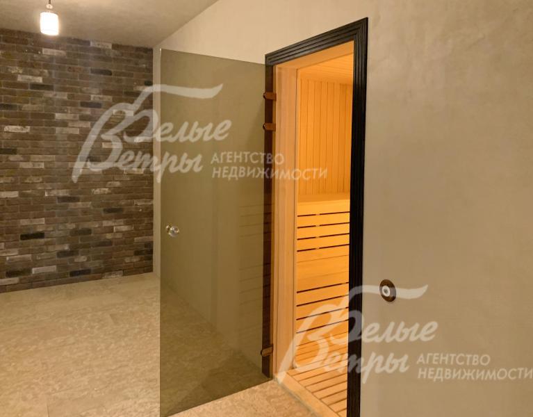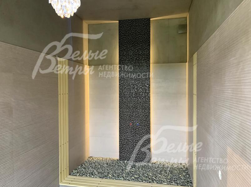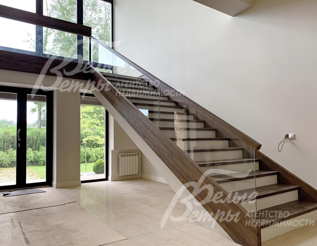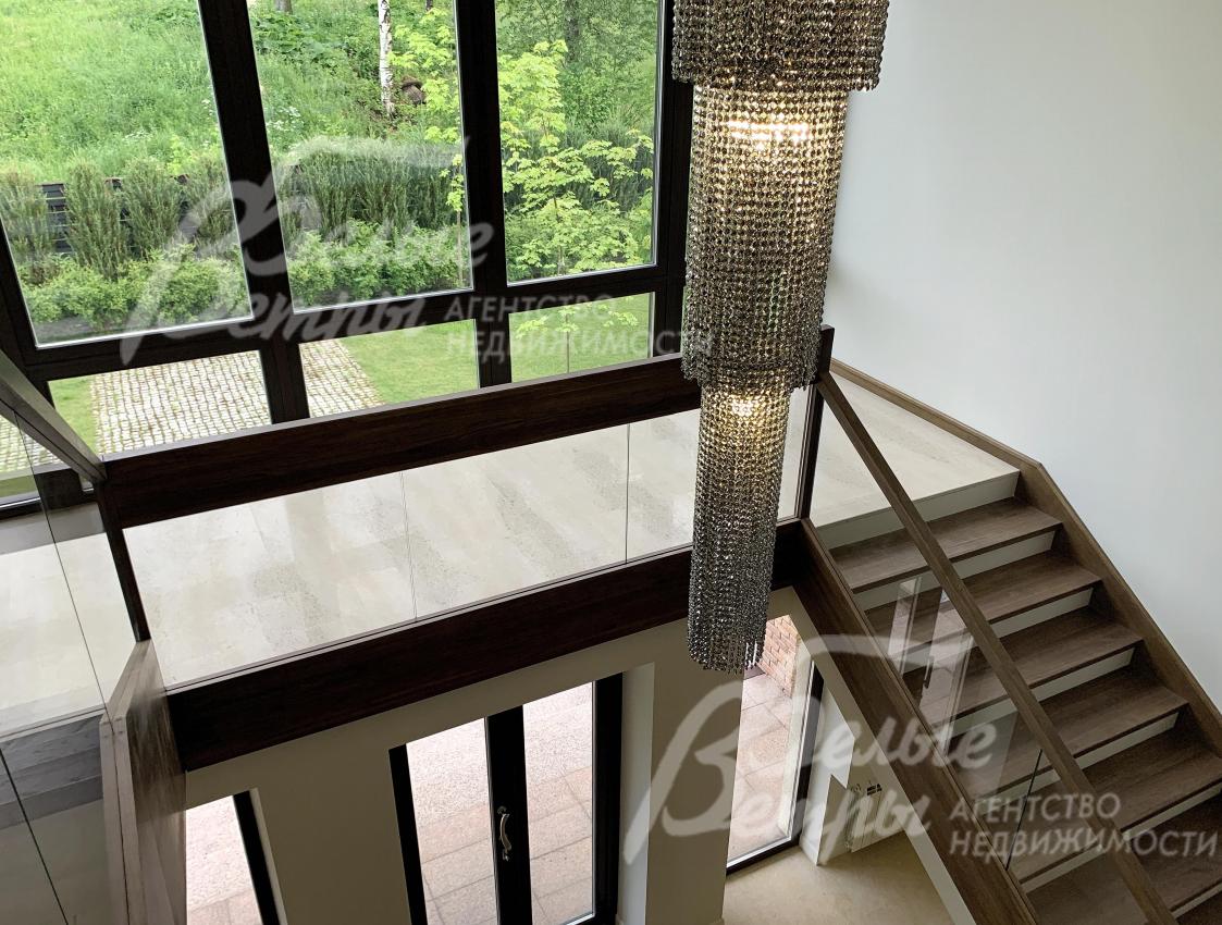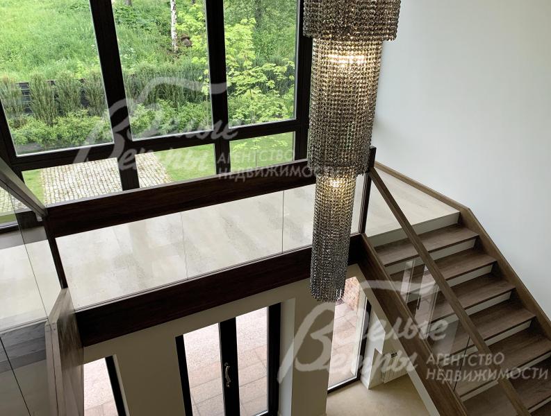 Описание внутренней отделки: авторские архитектура и дизайн, отделка дорогостоящими натуральными материалами. В санузлах на полу и стенах плитка с теплыми полами. Стены окрашены. В спальнях - обои. Пол в жилых помещениях - паркет. 4-х сторонний открытый камин в центре двухсветного зимнего сада. В одной из спален большая квадратная ванна из кирпича, облицованная изнутри деревом. В зоне отдыха стена отделана кирпичом. Зона СПА с переливным бассейном 18*4 м, есть зона с галькой на полу. В сауне печь посередине, за ней стена из камней гималайской соли, а по бокам по две полки симметрично друг другу. Вспомогательное строение с квартирой для персонала - под финишную отделку. Электрика - в стиле ретро (дерево, фарфор). Редкая по богатству лестница - каждый пролет шириной 150 см, расстояние между пролетами 3 метра. Общая ширина огромного двухсветного холла и лестничных пролетов 6 метров, такой же ширины межэтажная площадка с окном во всю стену. Сама лестница из бетона, ограждение - стеклянное с поручнем и обрамлением из темного ореха, ступени - массив темного ореха.