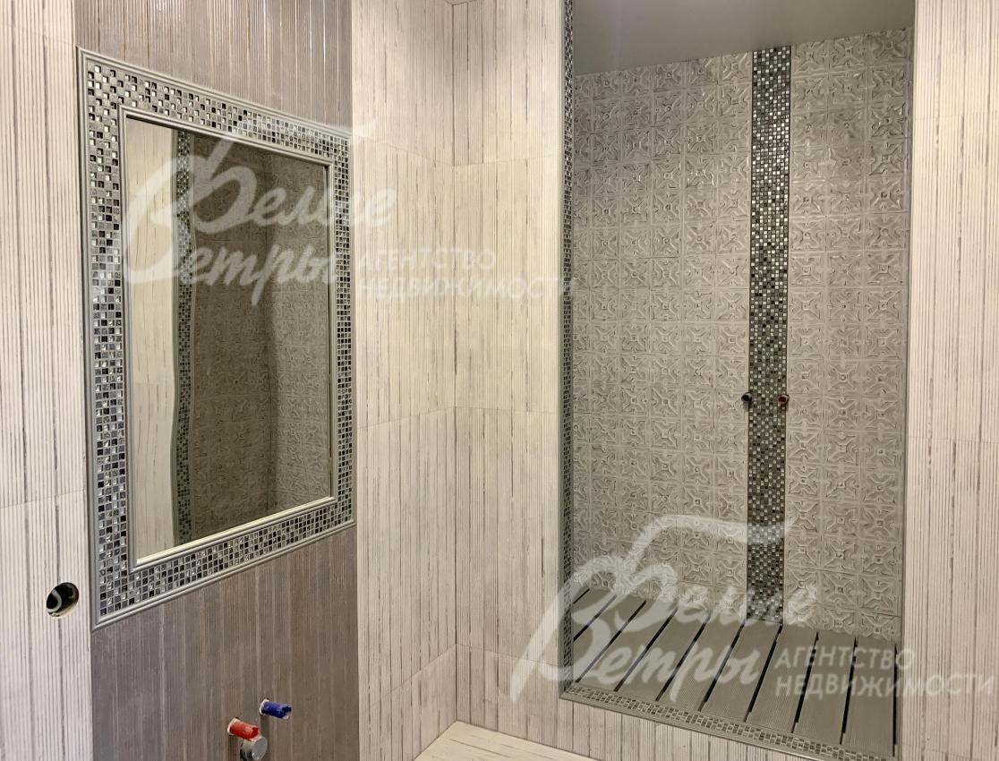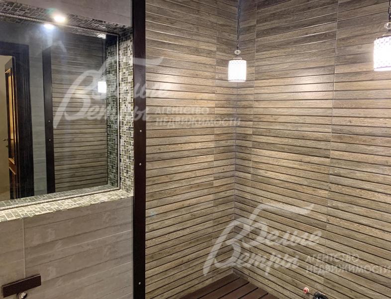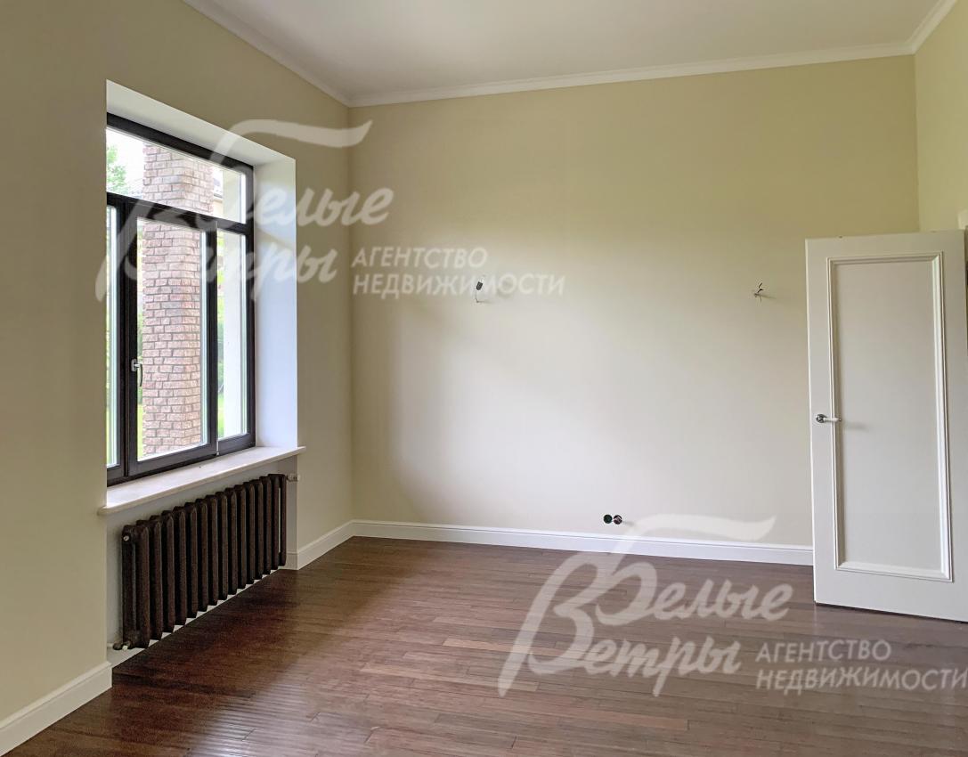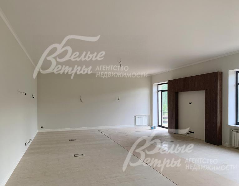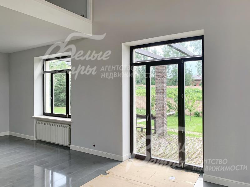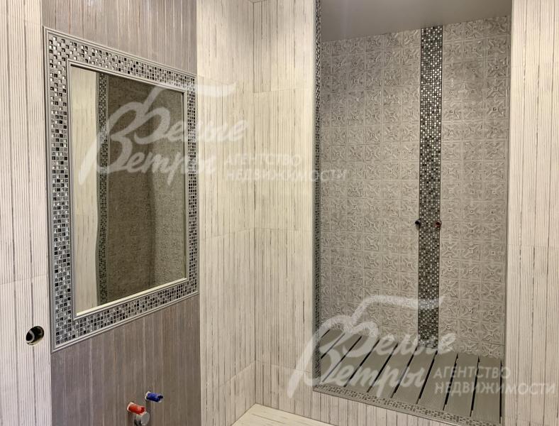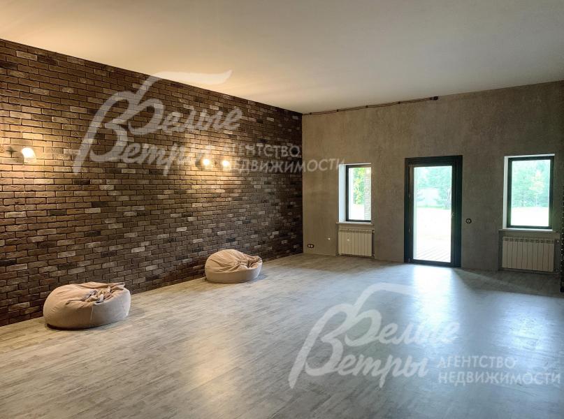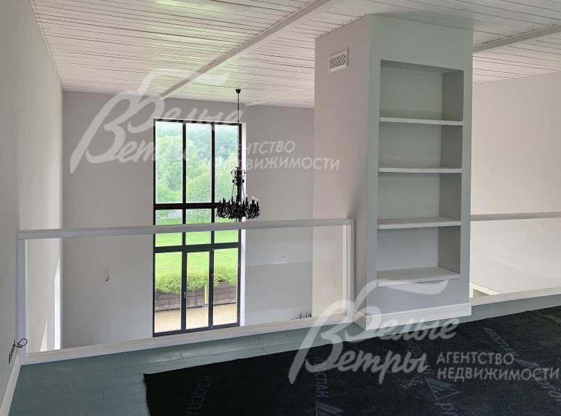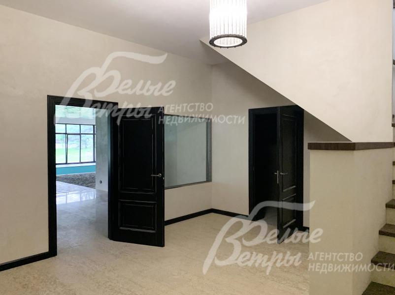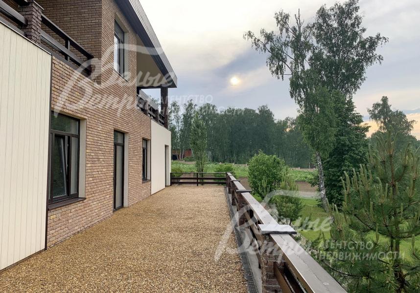Описание внутренней отделки: авторские архитектура и дизайн, отделка дорогостоящими натуральными материалами. В санузлах на полу и стенах плитка с теплыми полами. Стены окрашены. В спальнях - обои. Пол в жилых помещениях - паркет. 4-х сторонний открытый камин в центре двухсветного зимнего сада. В одной из спален большая квадратная ванна из кирпича, облицованная изнутри деревом. В зоне отдыха стена отделана кирпичом. Зона СПА с переливным бассейном 18*4 м, есть зона с галькой на полу. В сауне печь посередине, за ней стена из камней гималайской соли, а по бокам по две полки симметрично друг другу. Вспомогательное строение с квартирой для персонала - под финишную отделку. Электрика - в стиле ретро (дерево, фарфор). Редкая по богатству лестница - каждый пролет шириной 150 см, расстояние между пролетами 3 метра. Общая ширина огромного двухсветного холла и лестничных пролетов 6 метров, такой же ширины межэтажная площадка с окном во всю стену. Сама лестница из бетона, ограждение - стеклянное с поручнем и обрамлением из темного ореха, ступени - массив темного ореха.