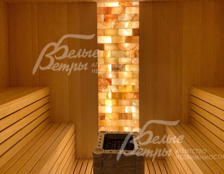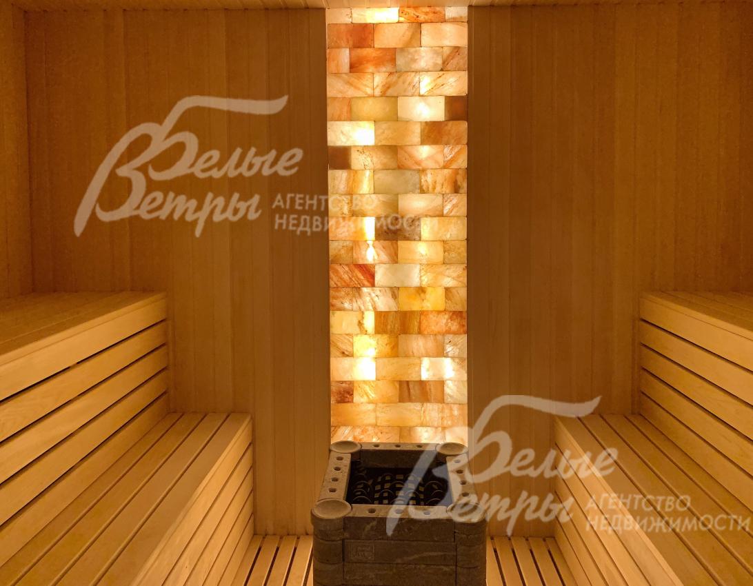 Опции: бассейн (18*4 м, глубина 1.2 м до 1.8 м, переливной с противотоком и малый бассейн-СПА 2*1.4 м, глубина 2.6 м); сауна (с финской топкой. В парилке стена выложена из гималайской соли); квартира для персонала (4 спальни, 2 санузла, кухня); терраса (8 штук, > 250 кв.м); камин (4-хсторонний); машиномест крытых: 4, в т.ч. в теплом гараже: 2; двухсветный зимний сад, лестничный холл с панорамным остеклением, тренажерный зал.