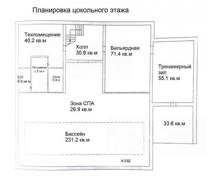 Цоколь: вследствие уклона участка со стороны улицы является цокольным, а со стороны двора - полностью надземным этажом. Зона СПА 250 кв.м, включая переливной бассейн 18*4 м с римским входом и купель-СПА, с выходом на участок (панорамное остекление), тренажёрный зал 55 кв.м, бильярдная 71 кв.м, сауна, санузел, техн.помещение (инженерная) 40 кв.м, терраса 34 кв.м.