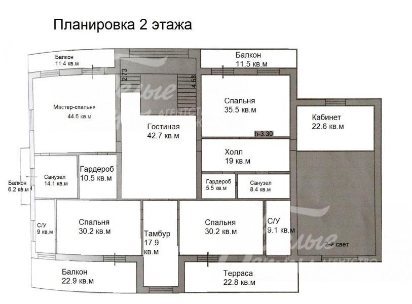 2-ой этаж: центральный холл 43 кв.м, мастер спальня 45 кв.м со своими ванной комнатой 14 кв.м, гардеробной 11 кв.м и и балконом 5 кв.м, видовой холл 19 кв.м, ведущий в кабинет 23 кв.м (расположенный на антресоли двусветного зимнего сада, с видом на участок) и в спальню 36 кв.м со своими санузлом 8 кв.м и гардеробной 6 кв.м, спальня 30 кв.м со своими санузлом 9 кв.м и балконом 23 кв.м и спальня 30 кв.м со своими санузлом 9 кв.м и балконом 23 кв.м, гардеробная 18 кв.м (на 2 спальни).