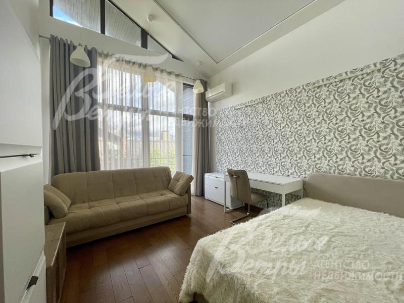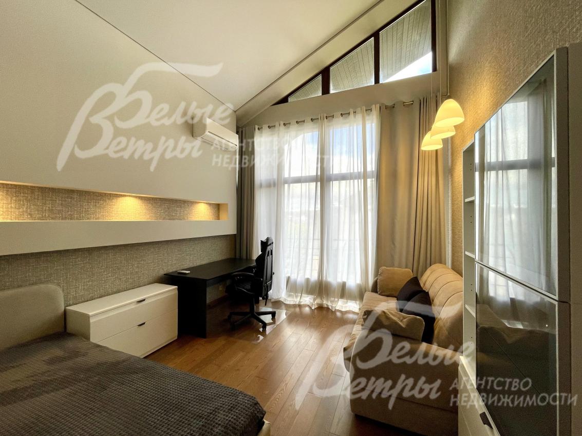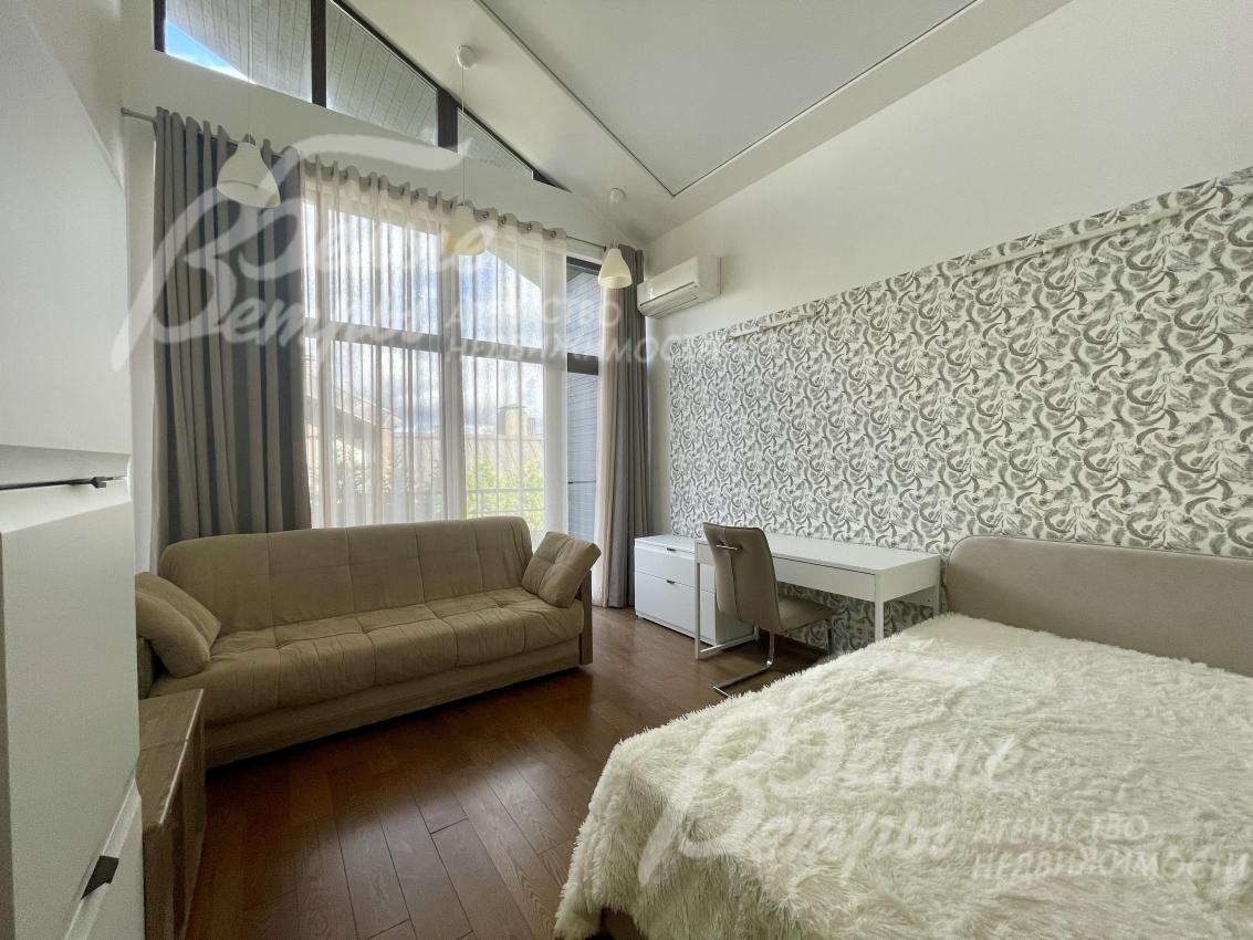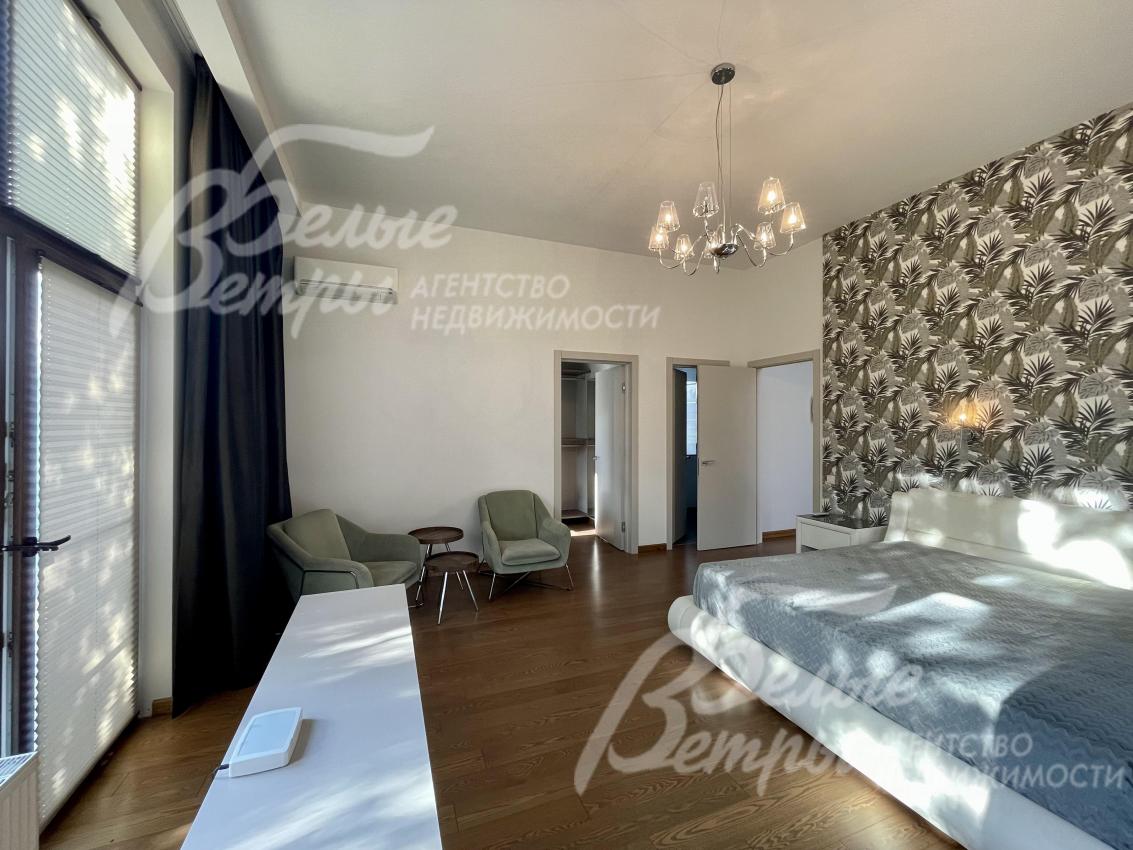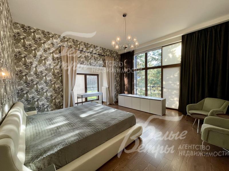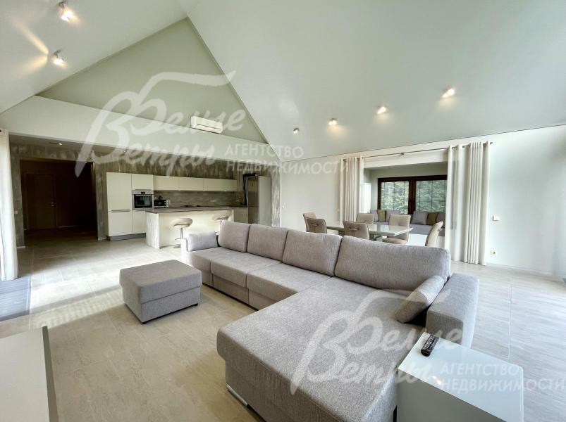 Мебель, оборудование: установлен кухоный гарнитур с островом светло-бежевого цвета со встроенной техникой: вытяжка, варочная поверхность Gorenje, духовой шкаф Bosch, посудомоечная машина Hotpoint Ariston, а также отдельно стоящий двухкамерный холодильник siemens. В зоне гостиной обеденная группа: стол из массива дерева на 6 персон со стильными стульями. В гостиной большой бежевый угловой диван и дровяной камин. В главной спальне большая кровать с прикроватными тумбочками, тумба под ТВ, в двух спальнях раскладывающиеся мягкие диваны, оборудованы гардеробные. Везде карнизы, шторы, занавески, рулонные шторы, в комнатах встроенные светильники, красивые люстры, а также бра на стенах.