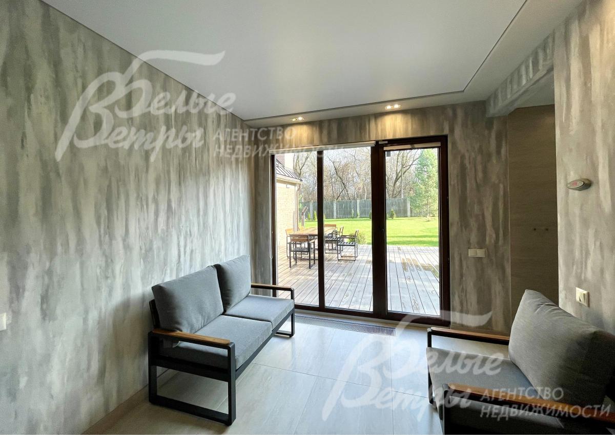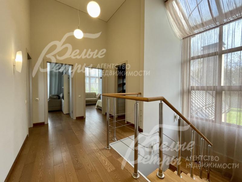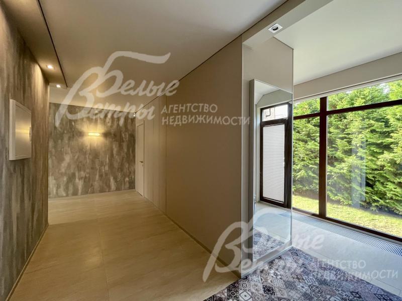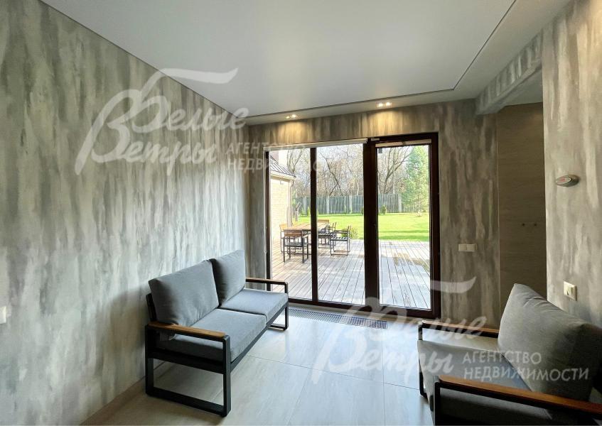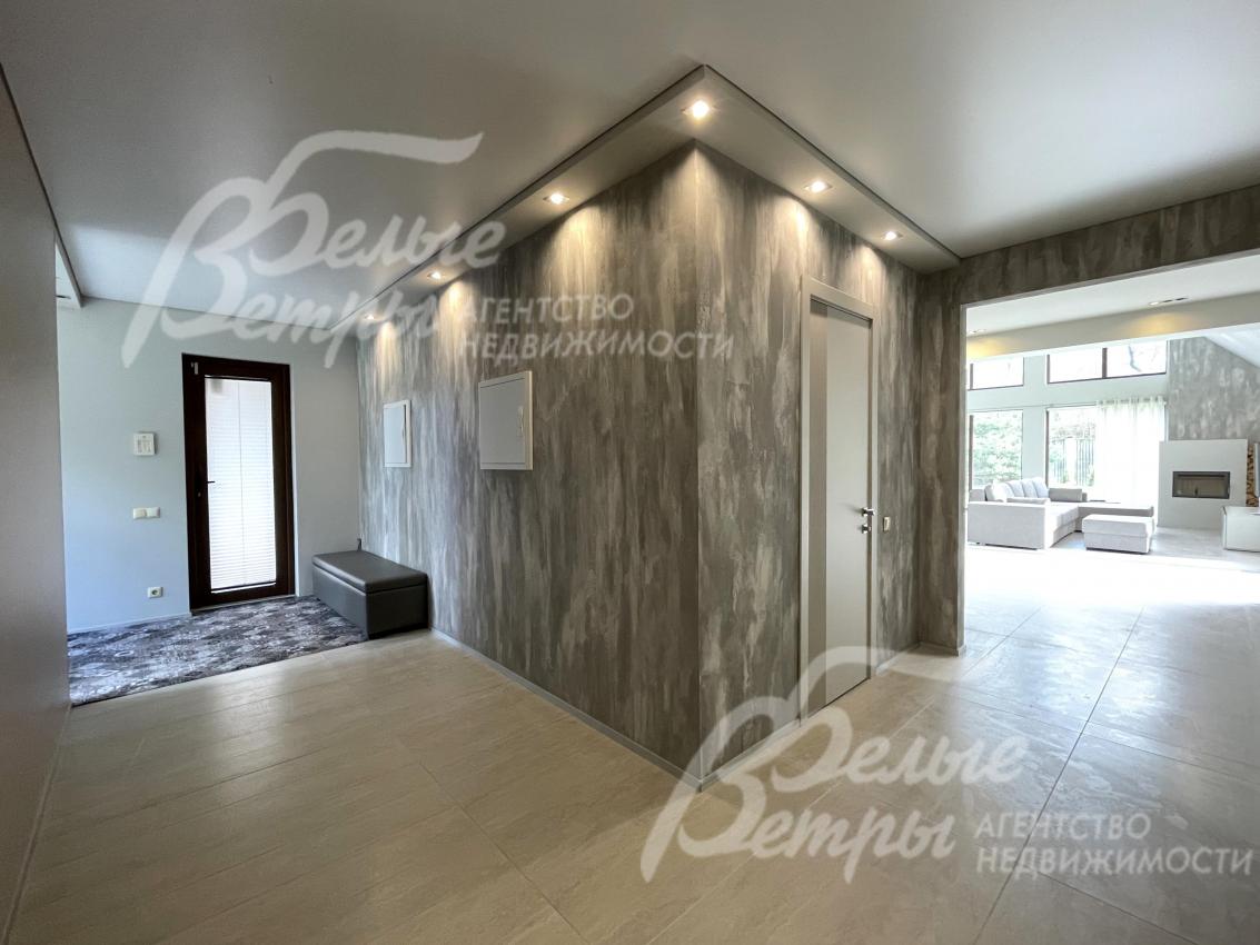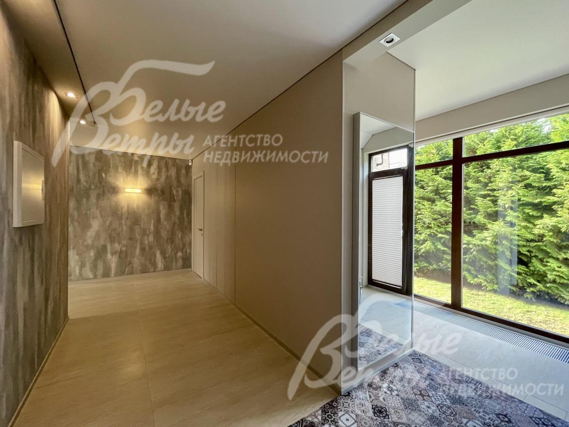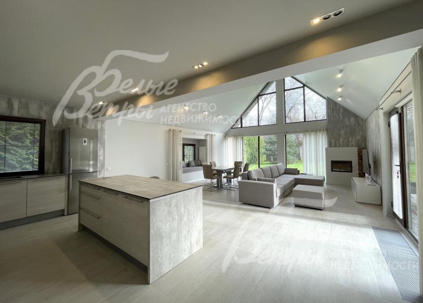Описание внутренней отделки: выполнена дизайнерская отделка в современном стиле минимализм. Панорамное остекление от пола до потолка. Отделка внутренних стен: ГКЛ 2 слоя + покраска/обои. Полы: керамогранит/инженерная доска, водяной тёплый пол (где плитка). Потолки: ГКЛ 2 слоя + покраска/натяжные потолки (Бельгия). Установлена сантехника Kohler, Roca, смесители Grohe. На 1-м этаже внутрипольные конвекторы, стальные панельные радиаторы. Двери: МДФ/БСП.