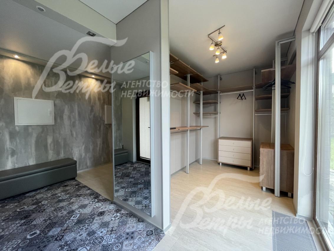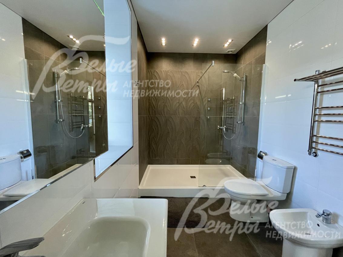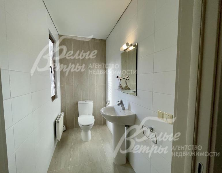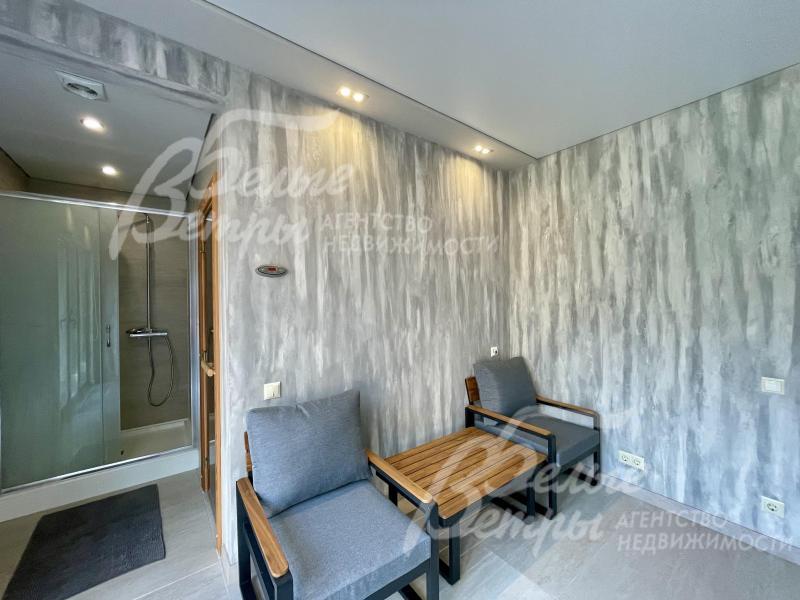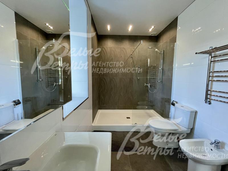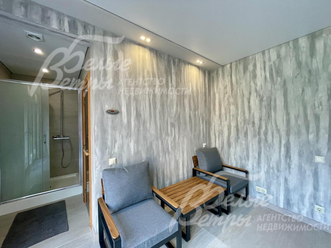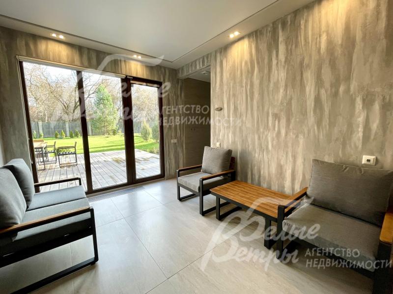 Описание внутренней отделки: выполнена дизайнерская отделка в современном стиле минимализм. Панорамное остекление от пола до потолка. Отделка внутренних стен: ГКЛ 2 слоя + покраска/обои. Полы: керамогранит/инженерная доска, водяной тёплый пол (где плитка). Потолки: ГКЛ 2 слоя + покраска/натяжные потолки (Бельгия). Установлена сантехника Kohler, Roca, смесители Grohe. На 1-м этаже внутрипольные конвекторы, стальные панельные радиаторы. Двери: МДФ/БСП.