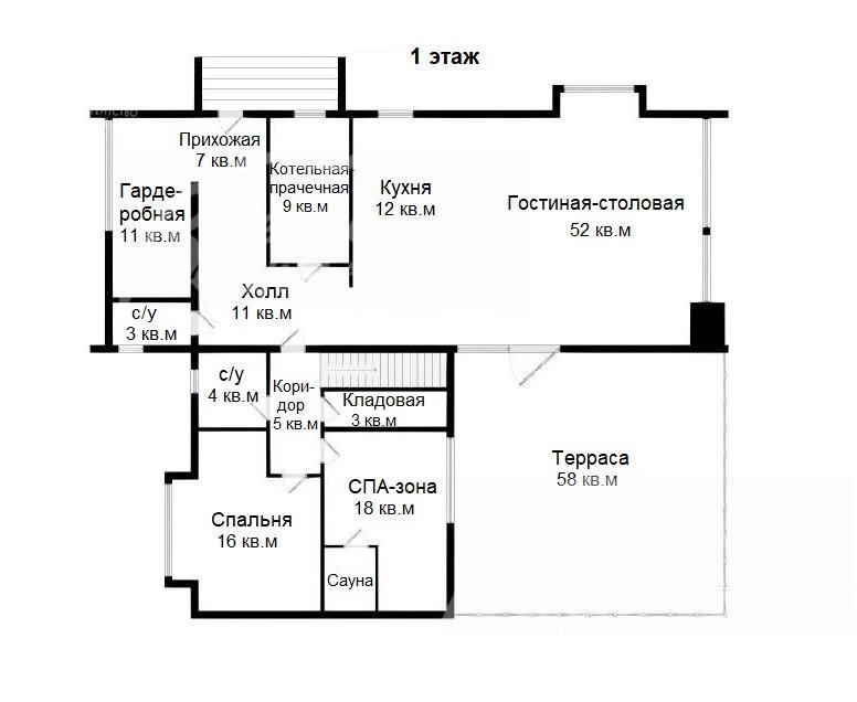 1-ый этаж: прихожая 7 кв.м, гардеробная 11 кв.м, санузел 2.6 кв.м, котельная-постирочная 8 кв.м, кухня 11.5 кв.м, гостиная-столовая 51.6 кв.м, санузел 4 кв.м, кладовая 3.4 кв.м, сауна 17.5 кв.м, спальня 15.5 кв.м, терраса 41 кв.м