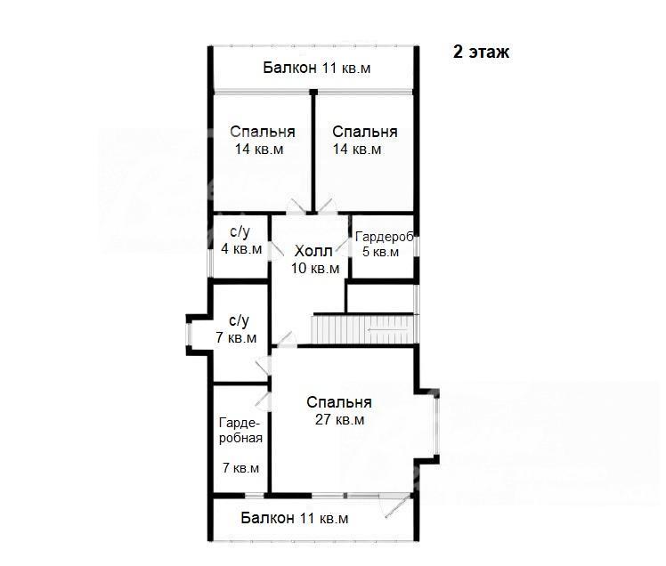 2-ой этаж: холл 10.4 кв.м, мастер-спальня 26.7 кв.м с балконом 10.5 кв.м, с гардеробной 7 кв.м и своим санузлом 6.6 кв.м, спальня 14 кв.м с выходом на балкон 10.5 кв.м, спальня 14 кв.м, санузел с ванной 4 кв.м, гардероб 5 кв.м