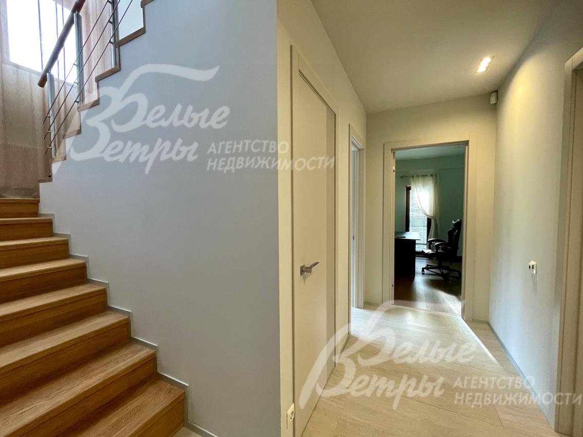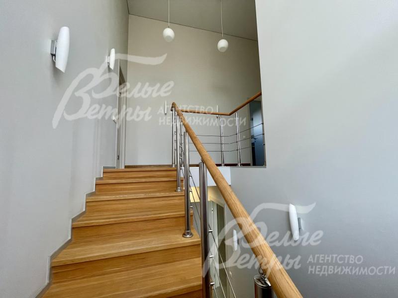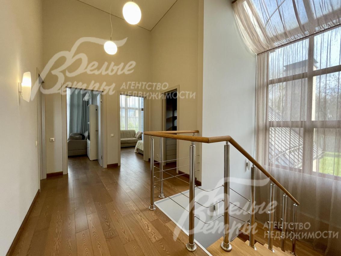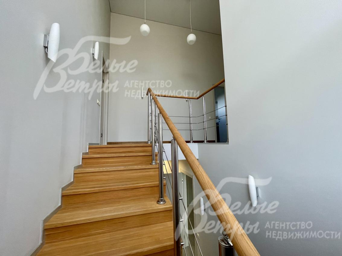 Дополнительная информация о доме: лестничный марш на металлокаркасе со ступенями из массива дуба, ширина 104 см. Высота потолков: 1 этаж в гостиной - от 2.6 м до 5.2 м, во всех остальных помещениях - 2.6 м, 2 этаж - от 2.7 м до 4.6 м