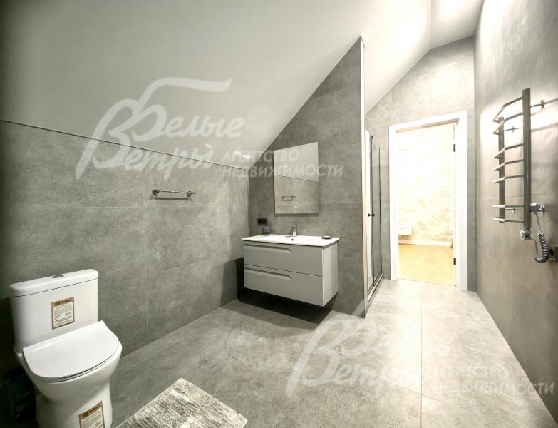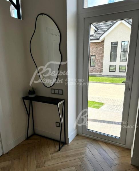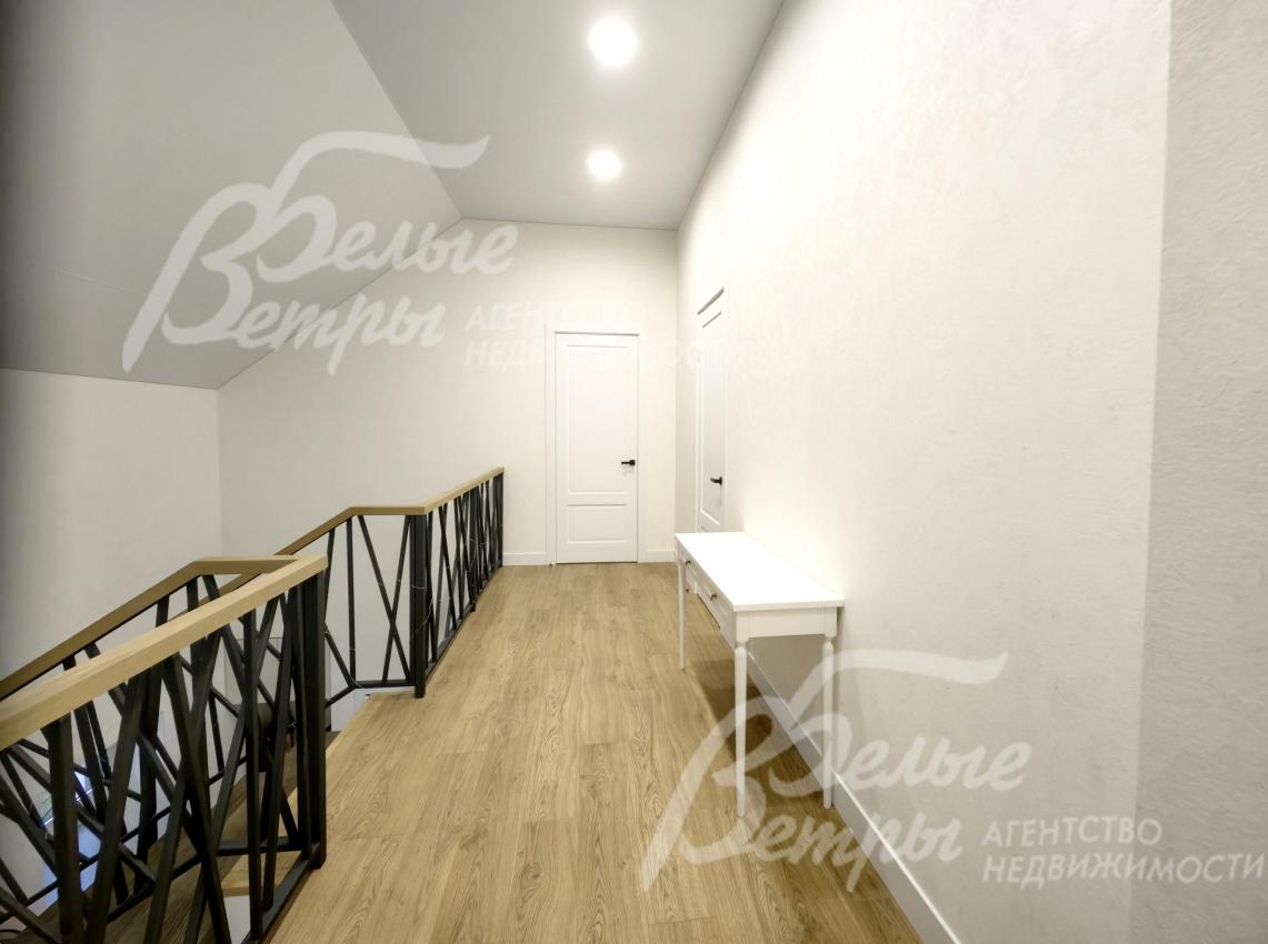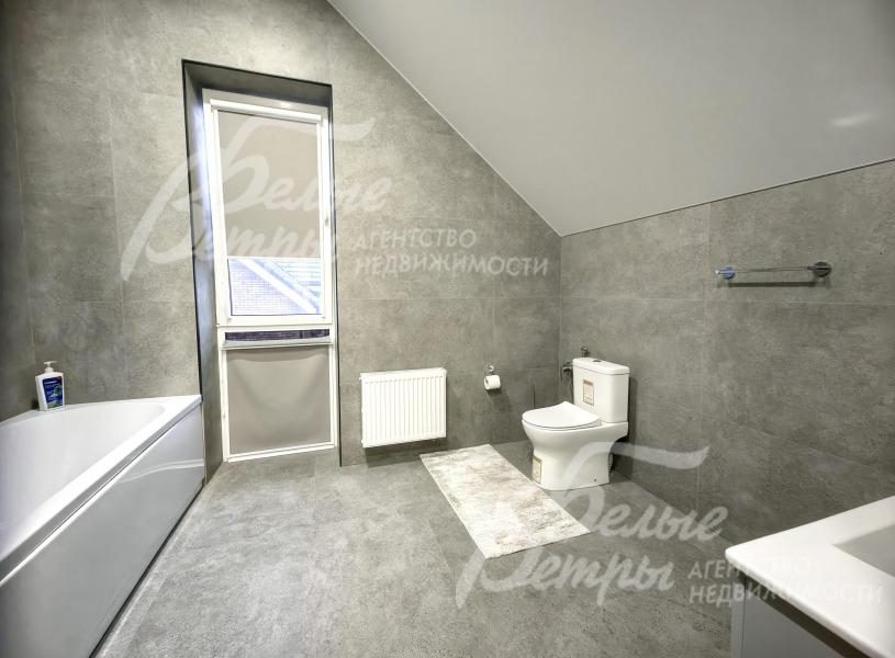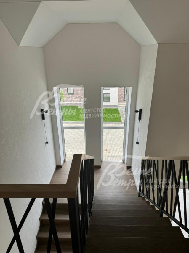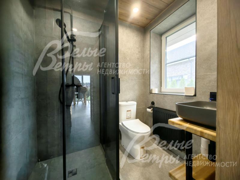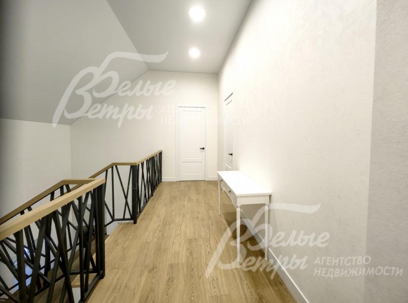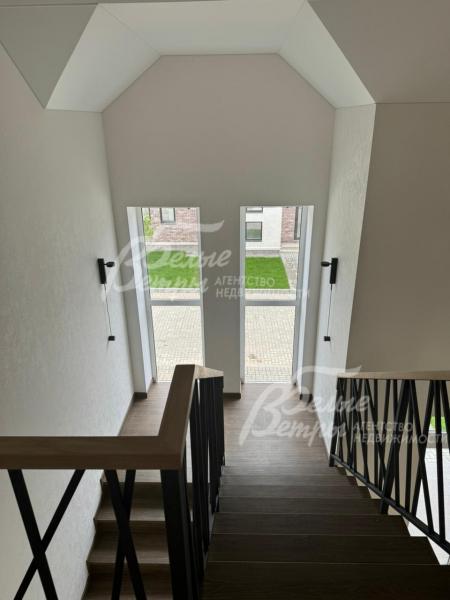 Описание внутренней отделки: Стильная отделка в современные пастельных тонах: стены в основном светло-серого цвета, высокие потолки, много света, ярких элементов интерьера, в том числе черного цвета (смесители, души, радиаторы отопления, другие). Все окна в доме панорамные. В санузлах - плитка до потолка, много декора. Зеркала в солидных рамах. Двери филенчатые, белого цвета. Качественная стильная сантехника, отдельно стоящая ванна, большие душевые кабины с трапами. Стальные панельные радиаторы. Лестничный марш на бетонном основании шириной 112 см, ступени из керамогранита, 32*18 см, ограждение металлическое с деревянным поручнем.